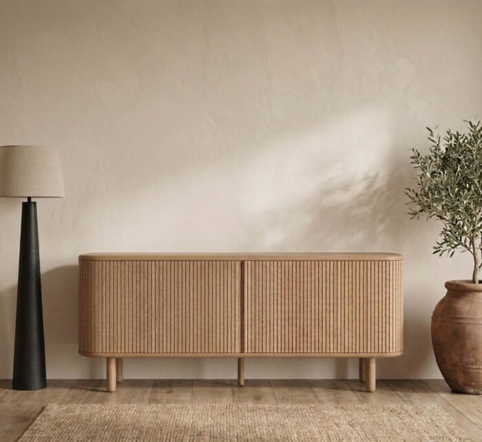- Design & Material: The sideboard usually features clean lines and a minimalist aesthetic, suitable for contemporary and transitional decor styles. It’s typically made from durable engineered wood or solid wood, often featuring a smooth or textured laminate or wood veneer finish. The colors may range from natural wood tones to modern finishes like matte white, gray, or even a bold, deep hue.