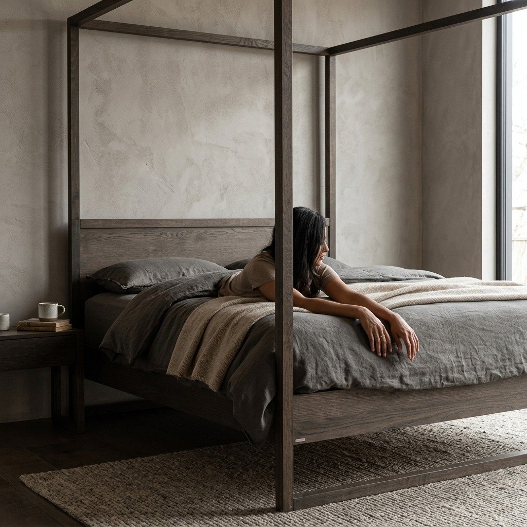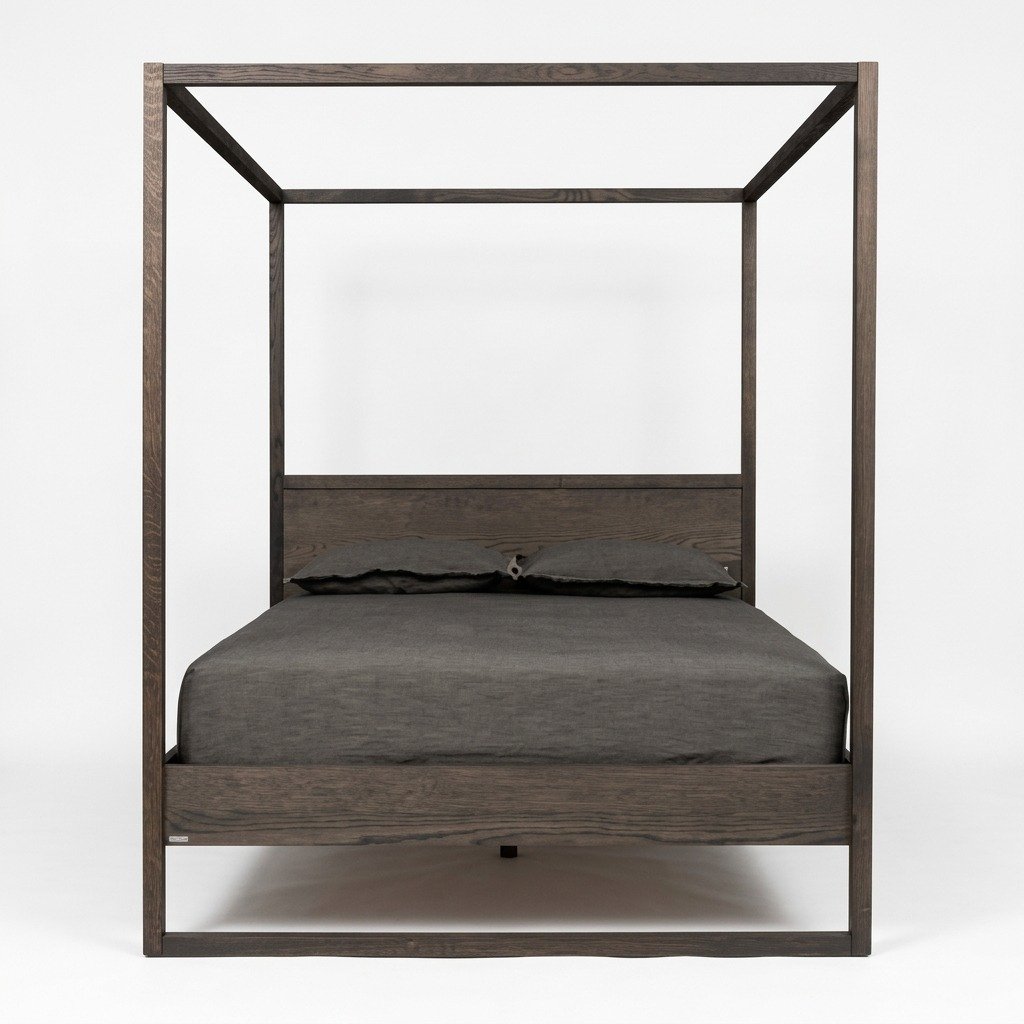 - Modern Silhouette: Crafted from sturdy wood, this bed redefines the classic four-poster style with clean lines and minimalist geometry. The open structure creates an airy feel, making it ideal for both small and large spaces, adding depth without overwhelming the room. PRITI 4-Poster Bed (Black Solid Wood)