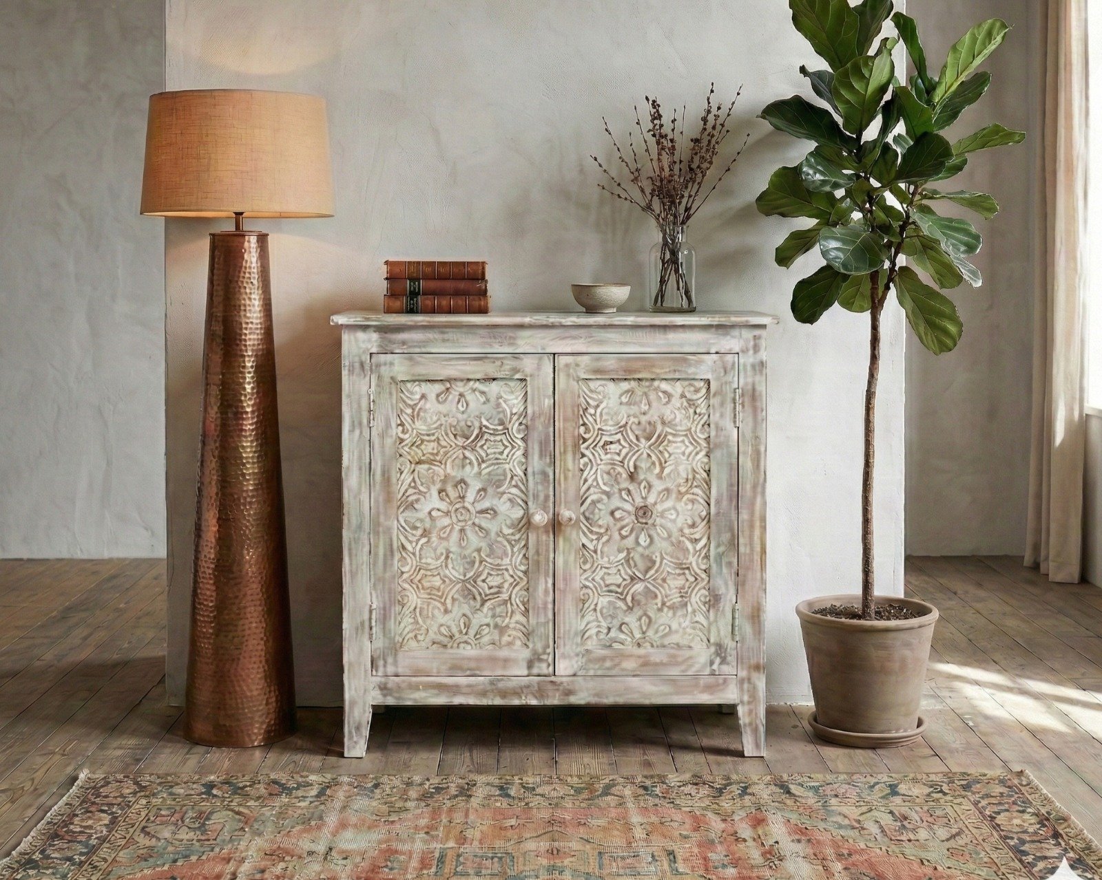 The design of the PRITI Accent Cabinet reflects a global aesthetic, with unique details that celebrate the diversity of craftsmanship from around the world. The use of hardwood not only ensures durability but also highlights the natural beauty and character of the material, making each cabinet a one-of-a-kind piece. Its versatile style allows it to seamlessly fit into various decor themes, whether contemporary, eclectic, or traditional.