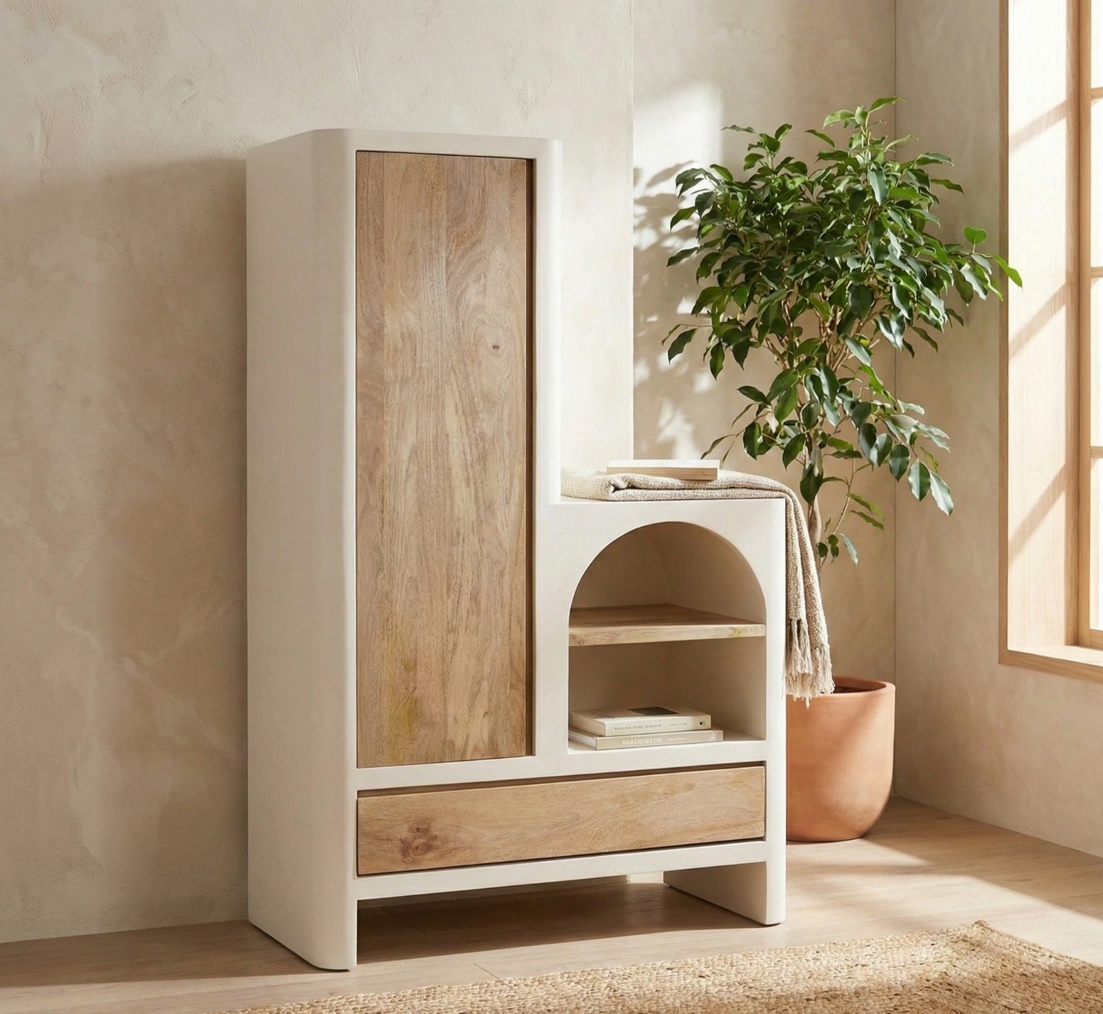 Perfect voor het creëren van een harmonieuze, authentieke sfeer de PRITI crèmekleurige asymmetrische kledingkast is zowel een functionele opbergoplossing als een statement piece. Combineer het met andere items uit het assortiment om een goed afgeronde, prachtig gecoördineerde ruimte te creëren.