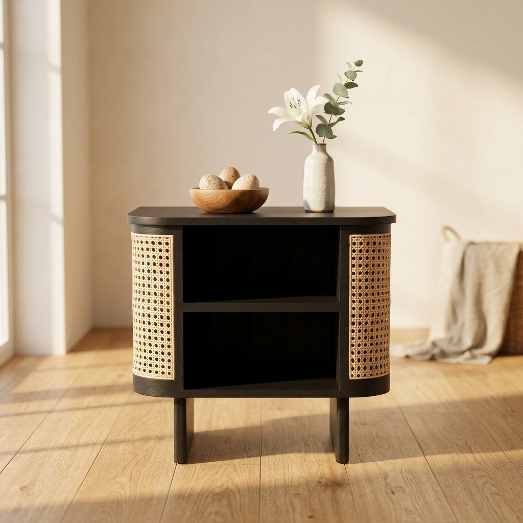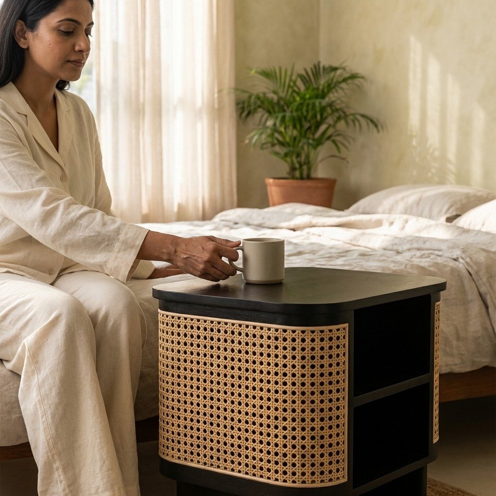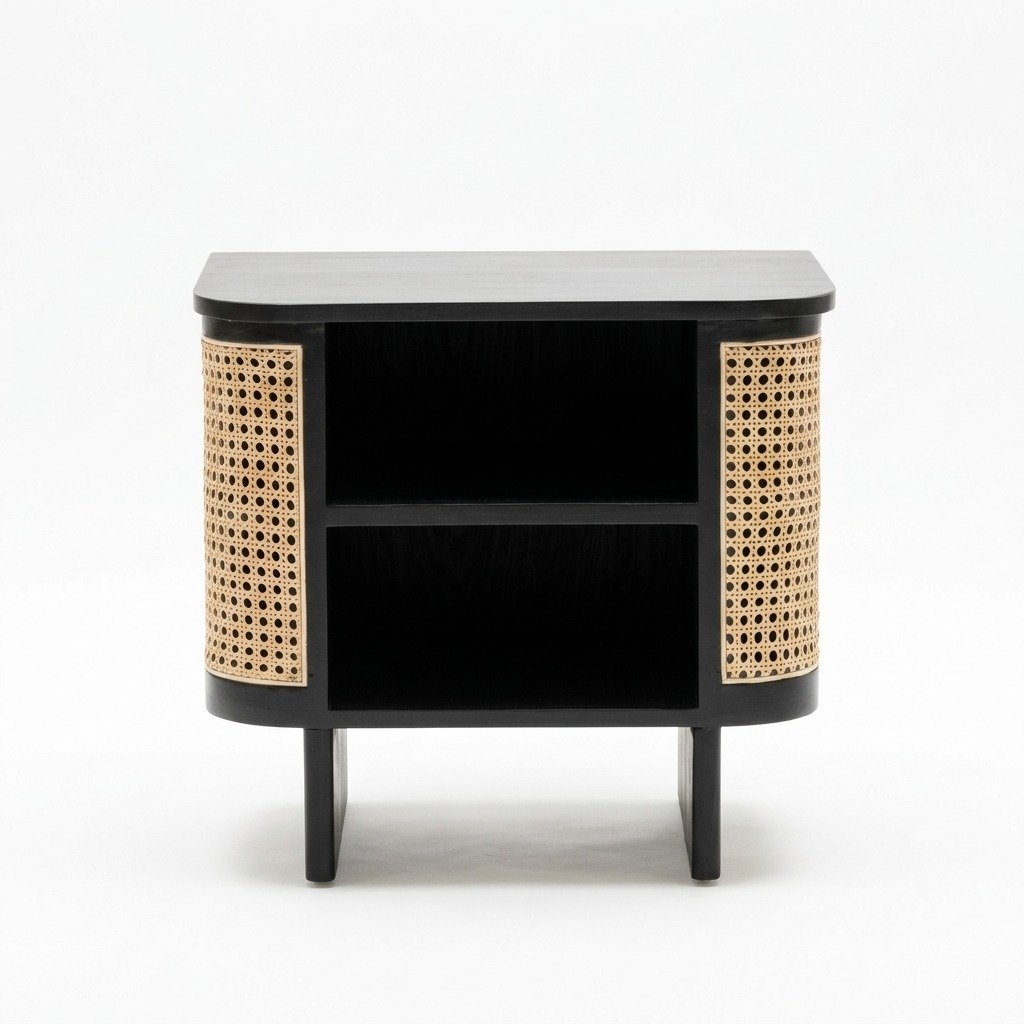PRITI Black Wooden Bedside Table with Cane Detailing