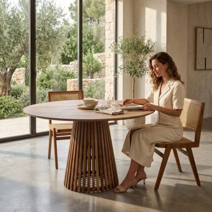 The table features a round top that adds a touch of warmth and intimacy to your dining area, making it perfect for family meals or entertaining guests. Its innovative spider leg design allows for flexible chair placement, providing convenience and comfort without compromising style. This thoughtful design makes it easy to accommodate different seating arrangements, promoting a welcoming atmosphere.