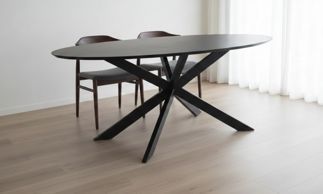 The soft, oval shape of the table creates an inviting atmosphere, perfect for fostering conversation during family meals or dinner parties. Its design encourages easy movement and accessibility for all diners. A modern black cross leg supports the table, adding a contemporary flair that complements its overall aesthetic.PRITI Black Ovel Dining Table