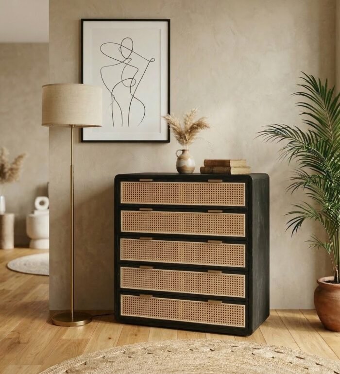 The PRITI Chest 5 Drawers Black Wood with Cane is a sophisticated and practical storage solution that brings a touch of elegance to any room. Its combination of modern design, functional storage, and high-quality materials makes it an excellent choice for those looking to enhance their space with both style and utility. PRITI Chest 5 Drawers Black Wood with cane