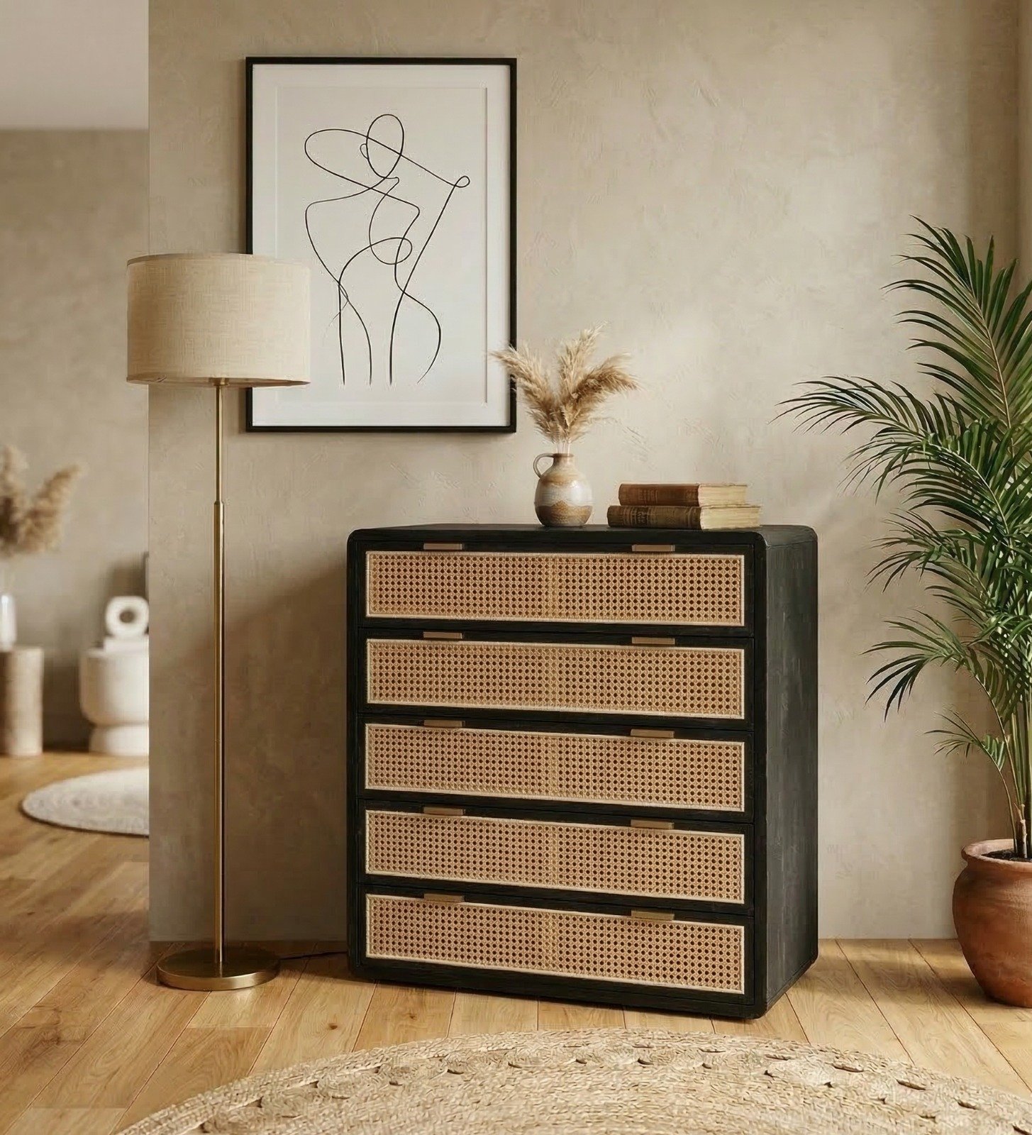 - Top Surface: The top surface of the chest is smooth and spacious, providing additional room for decorative items such as picture frames, vases, or a lamp. It can also serve as a functional surface for items you need to keep close at hand, such as books or accessories.PRITI Chest 5 Drawers Black Wood with cane