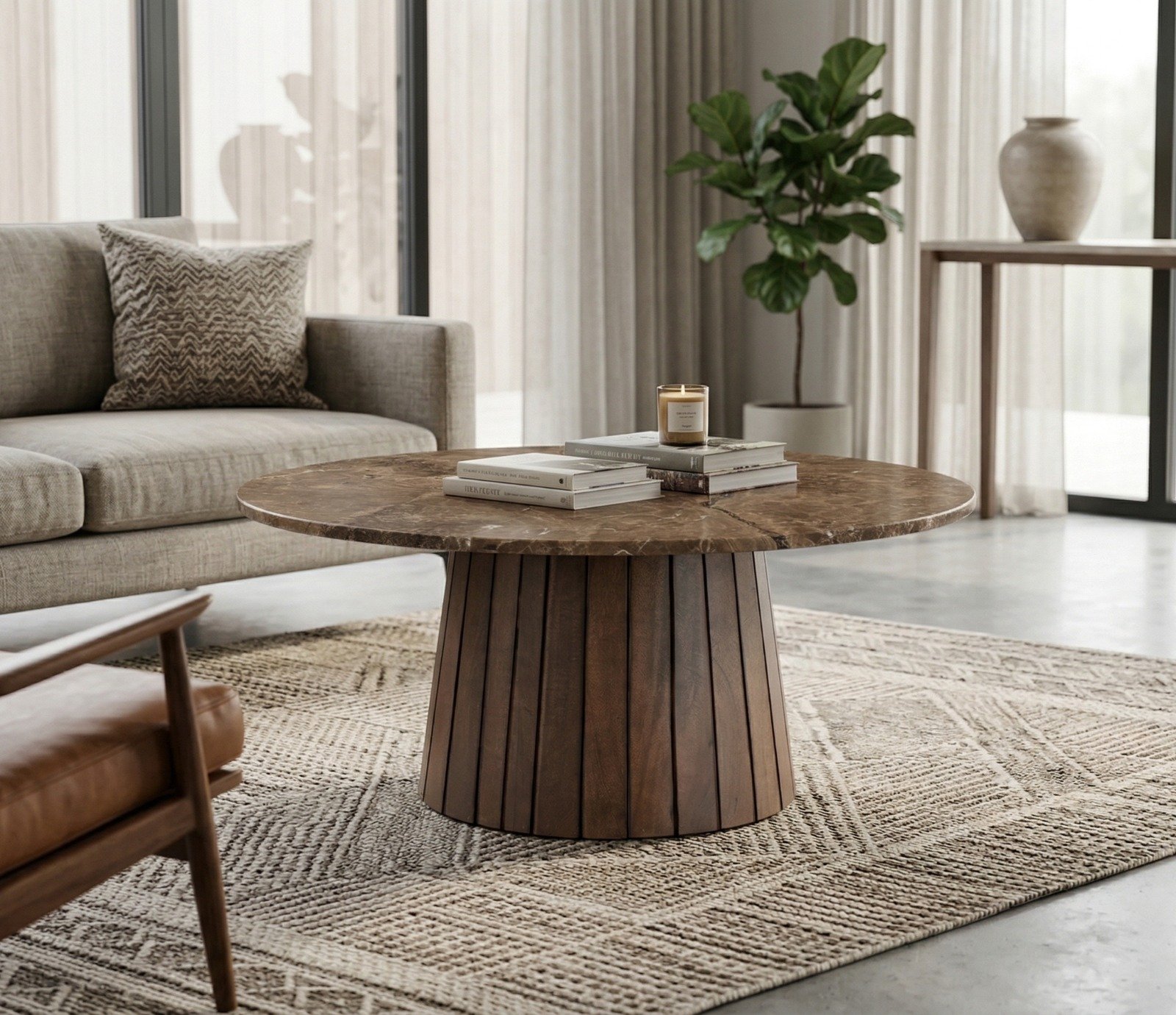 Adding to the table’s charm is its base, made from slim warm brown slats. These slats not only complement the rich hues of the marble top but also introduce warmth and texture to your interior, creating a balanced contrast between natural stone and wood-inspired elegance. The sleek design of the slatted base ensures that the coffee table maintains a sense of lightness and modernity, making it a versatile piece for a variety of interior styles, from contemporary to transitional.
