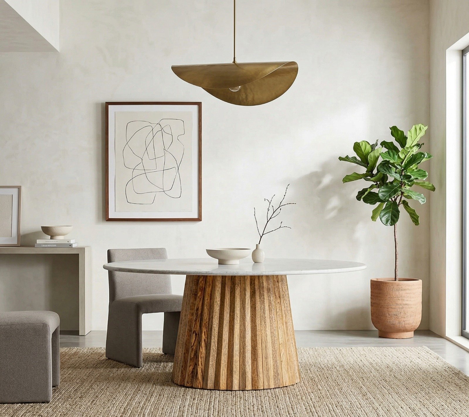 - Marble: The white marble top is a striking contrast to the wooden base. Known for its luxurious feel, the marble features subtle veining, each piece possessing its own natural patterns and characteristics. This gives the table a sophisticated look while maintaining a serene, timeless appeal. PRITI COFFEE TABLE PLISSÉ WOOD