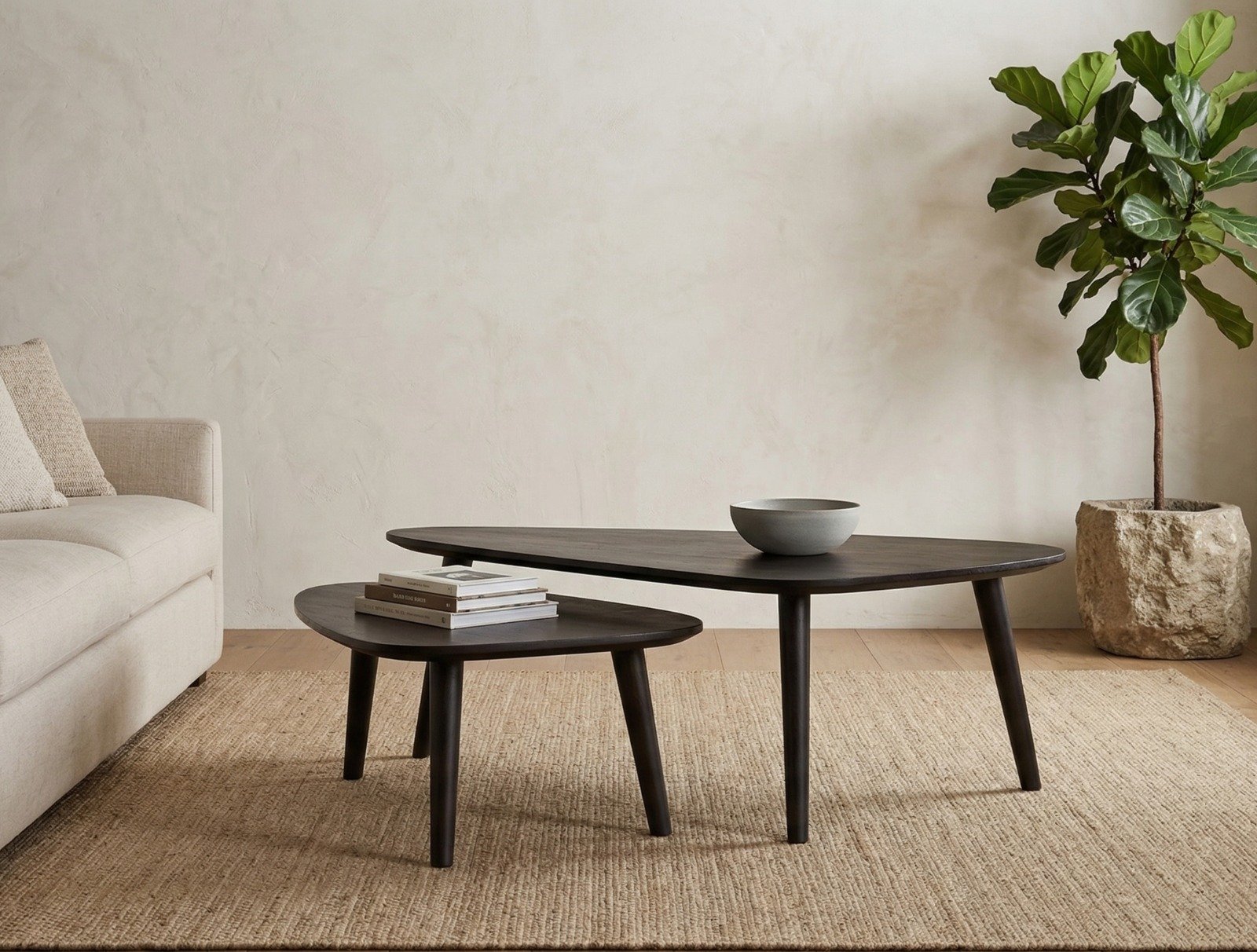 The organically shaped table tops feature a modern tapered edge, adding a touch of elegance to their minimalist design. This tapering effect gives the set a refined and polished look, elevating the aesthetic of your living space. You can easily slide the smaller table underneath the larger one, allowing for flexible placement and effortless storage when needed. This feature is particularly useful for maximizing space in smaller areas or for creating dynamic arrangements in more spacious rooms.