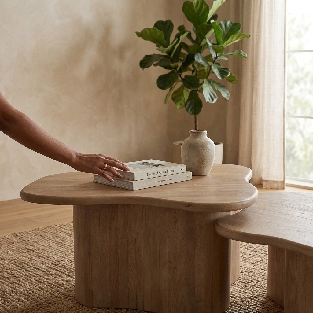 The PRITI Wood Coffee Table Set Natural is a stunning collection that showcases the beauty of organic design. Featuring uniquely shaped table tops and legs, this set brings a natural aesthetic to any living space. Crafted from sustainable wood, each table has a sandblasted brush finish that highlights the wood’s inherent character, with a range of color shades and surface irregularities ensuring that no two pieces are alike.