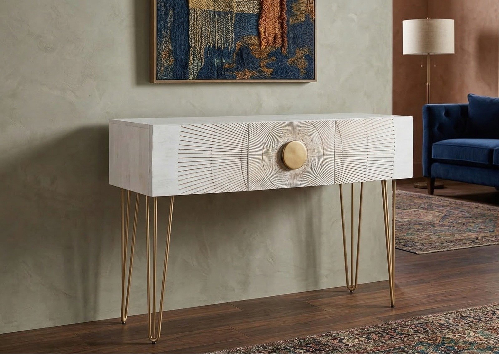 Design Features: The console table often features a simple rectangular top supported by sturdy metal legs. The white metal finish not only enhances the table’s modern aesthetic but also makes it easy to integrate with other decor elements. The design is typically free from excessive detailing, emphasizing a clean and unobtrusive look.