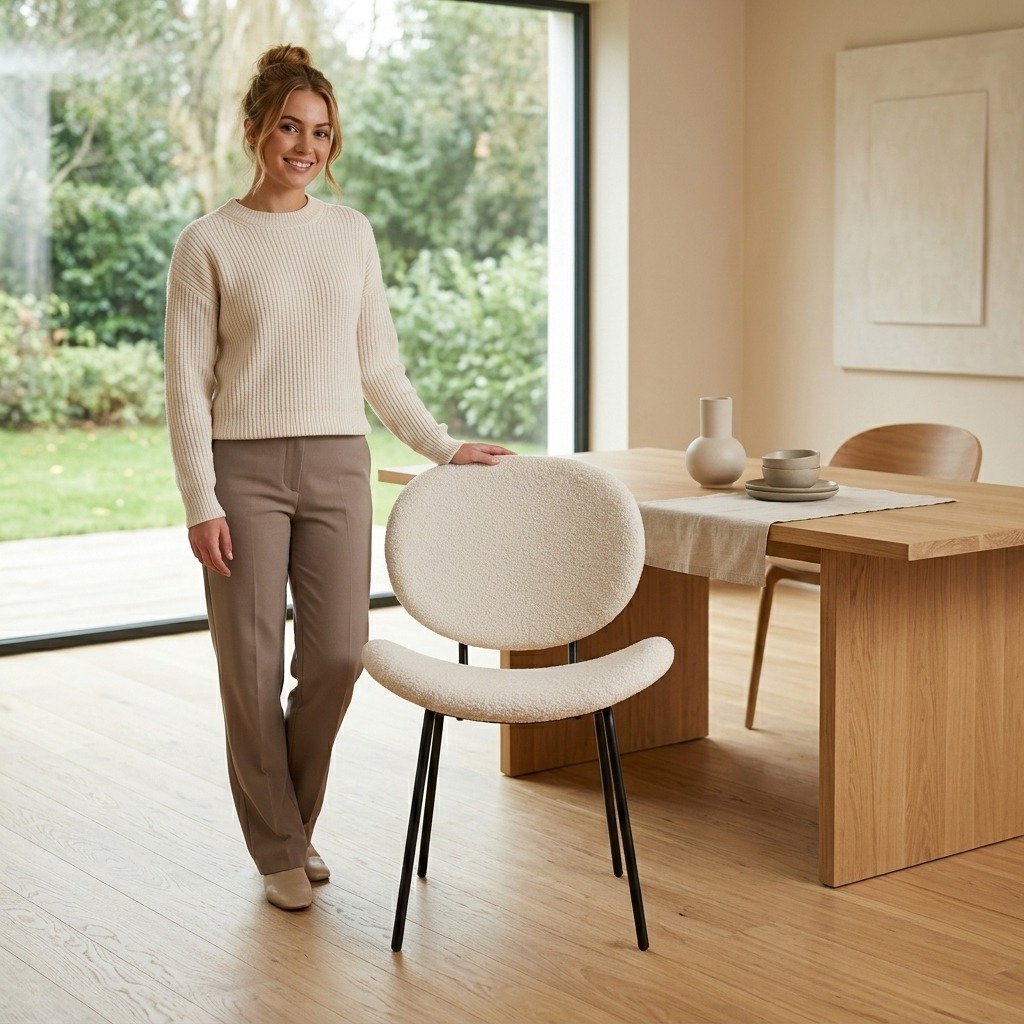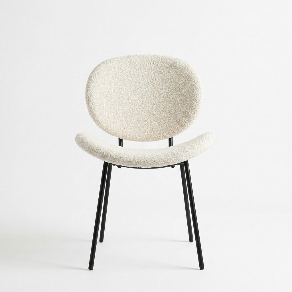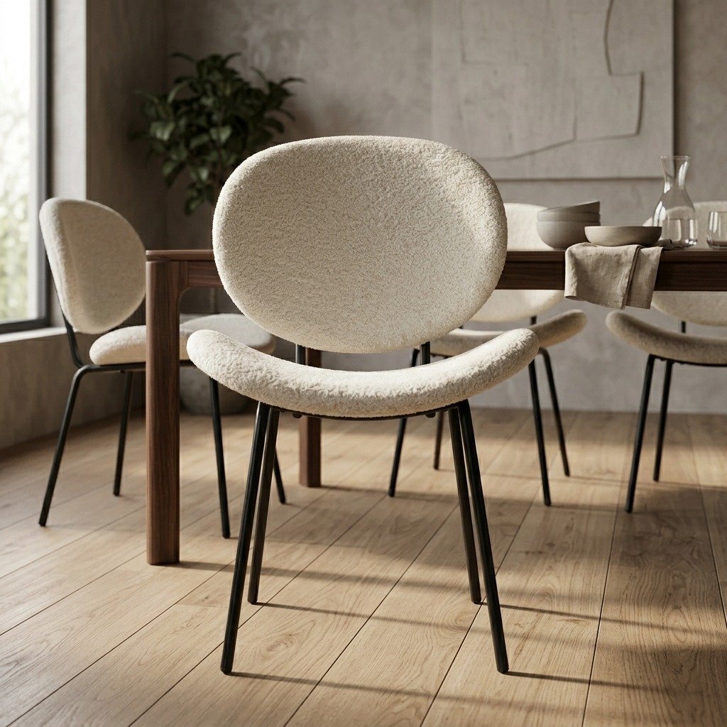 - Contemporary Elegance: The chair’s minimalist silhouette is complemented by the soft texture of its boucle fabric, creating a chic and inviting look that enhances any dining room, kitchen, or even office space.