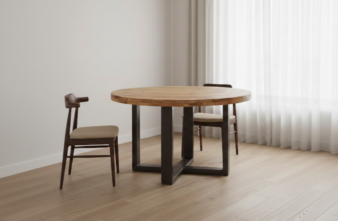 Whether you’re hosting a family dinner or enjoying a casual meal with friends, the PRITI Dining Table offers a welcoming atmosphere. Its stylish yet functional design makes it an ideal choice for both intimate gatherings and larger celebrations, allowing you to create memorable dining experiences for years to come. Embrace the perfect blend of aesthetics and practicality with this exceptional dining table.PRITI Round Mango Wood Dining Table With metal Legs