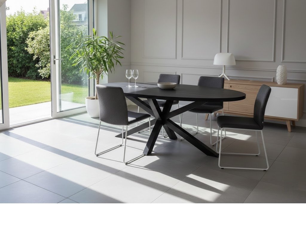 The PRITI Black Wooden Dining Table With black metal spider leg, in black, is an elegant and versatile piece available directly from stock in various sizes. Featuring a sleek oval-shaped wooden top, this table combines contemporary design with functional craftsmanship. The thick wood top rests on a PRITI Black Wooden Dining Table With black metal spider leg, offering a bold contrast and ensuring solid support for the entire structure.