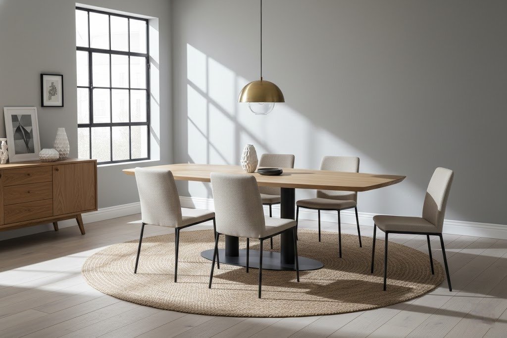 The PRITI Wooden Top Dining Table With Metal Legs from the brand is an exquisite addition to any dining space, available in a variety of colors and sizes to suit your style. This table features straight, black metal legs that provide a modern and industrial touch, complementing the overall design. The thick tabletop boasts a Danish oval shape, characterized by tapered edges that add elegance to its profile.