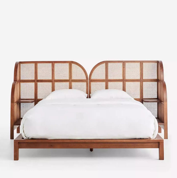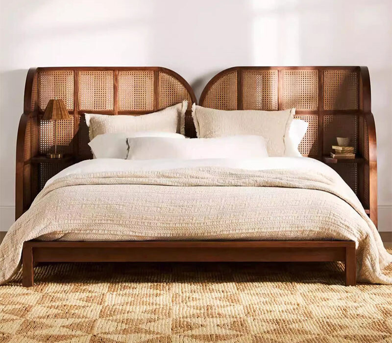 The  Priti FURNITURE solid wood  and rattan bed is designed to bring timeless elegance and lasting durability to any interior. Crafted from high-quality solid wood combined with handcrafted rattan detailing, this bed offers a refined retro aesthetic that fits perfectly in master bedrooms, boutique hotels, luxury apartments, and modern homestays. Available in both queen and king sizes, it provides excellent structural stability and long-term strength, making it an ideal choice for daily home use as well as high-traffic commercial environments.