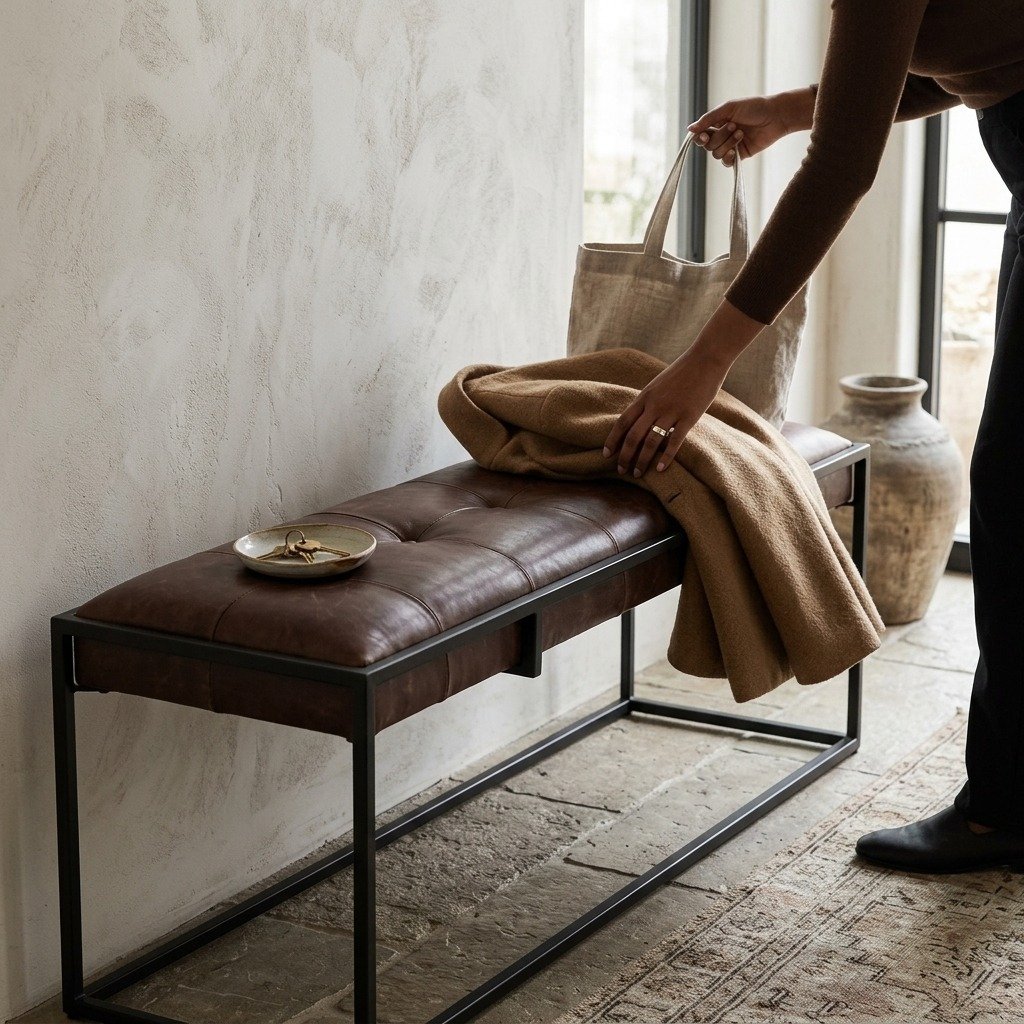 Elevate your home with the PRITI Genuine Leather Upholstered Bench, a perfect blend of classic charm and modern design. Crafted with a clean-lined, rectangular silhouette, this versatile bench adds both style and function to your space. At 13.75” deep, it’s an ideal choice for narrow hallways, entryways, or any area where space is limited, providing a comfortable spot to sit while putting on shoes or relaxing for a moment.