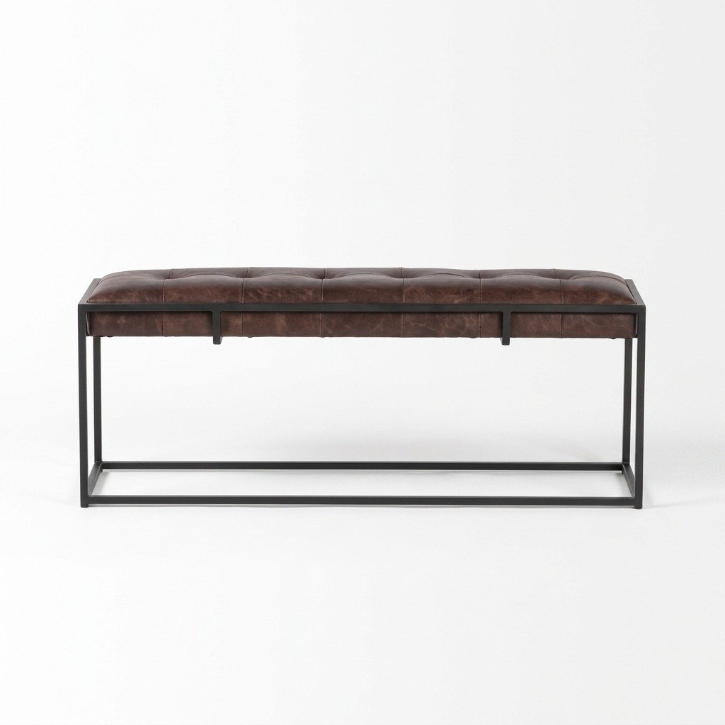 The bench features a sturdy iron base with a neutral finish, ensuring durability and stability while complementing a variety of interior décor styles. The top is fitted with a foam-filled, button-tufted cushion wrapped in premium genuine leather, intentionally distressed to achieve a sophisticated vintage look. This makes the bench not only visually appealing but also incredibly comfortable.