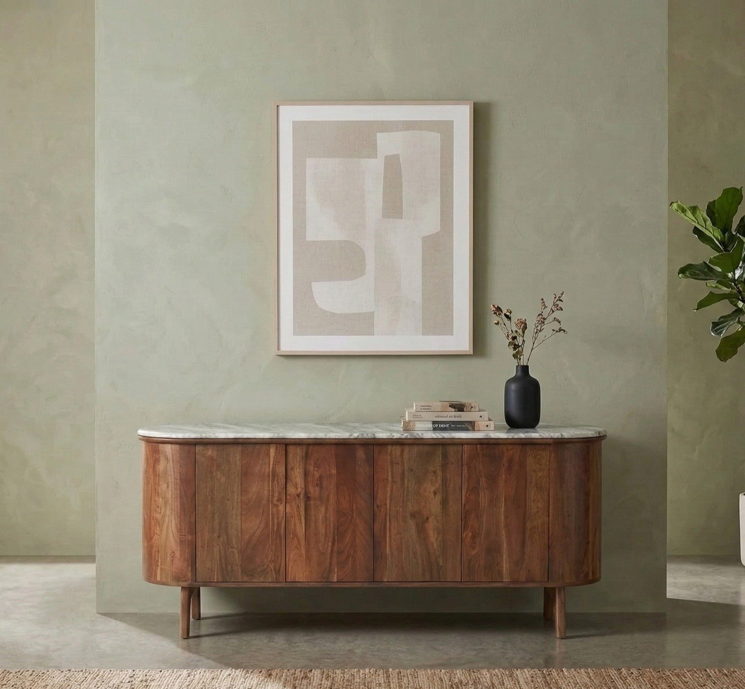 Materials and Finish: The sideboard is made from premium-quality marble and wood, ensuring both durability and aesthetic appeal. The wood used for the doors is carefully selected for its rich color and intricate veining, offering a refined and elegant look. The wood base is crafted from solid wood or high-quality engineered wood, finished in a way that enhances its natural grain and texture. The combination of these materials ensures that the sideboard is not only beautiful but also built to last, with a finish that is easy to clean and maintain.