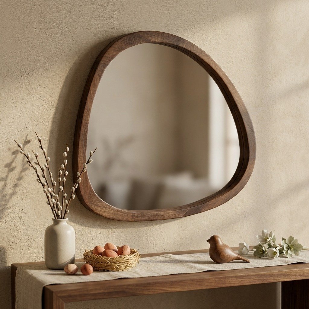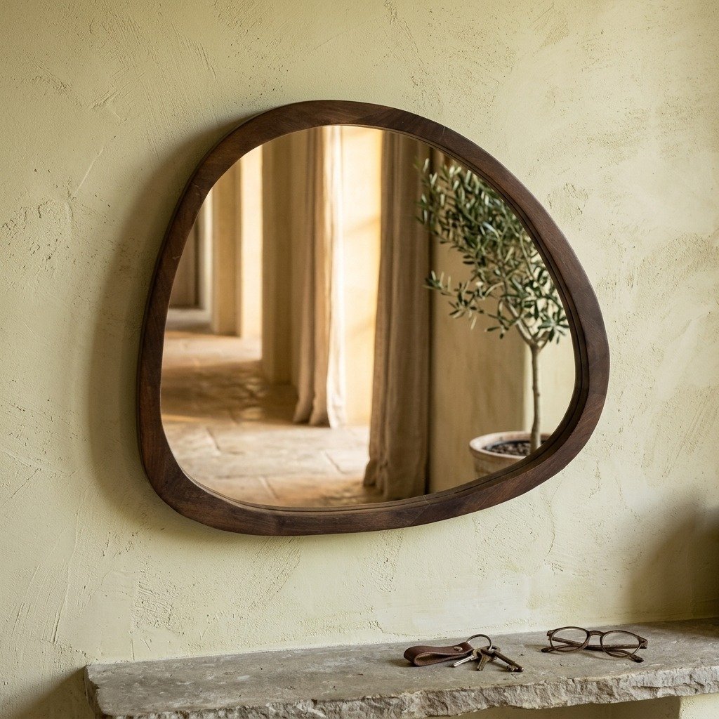 Experience the intrinsic charm of the PRITI Mirror, where contemporary design meets natural elegance. This exquisite mirror showcases an organic shape and a warm walnut color that beautifully reflects current interior trends, making it a versatile addition to any room.