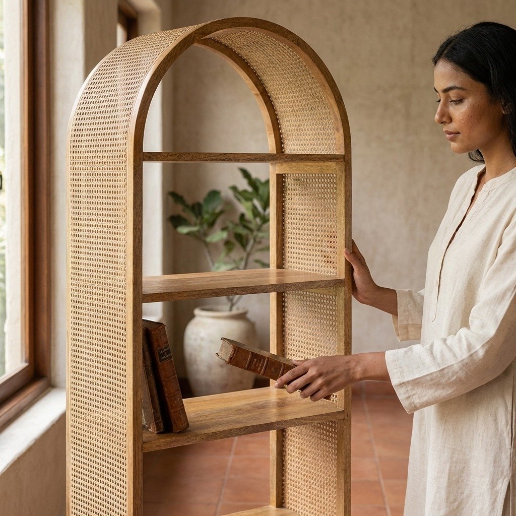 The PRITI Open Bookcase (Solid Wood with Cane ) is a sleek and functional piece designed to showcase books, decor, and other personal items in a stylish, open format. It’s ideal for living rooms, home offices, or bedrooms where both storage and display are needed. Here’s a detailed description: