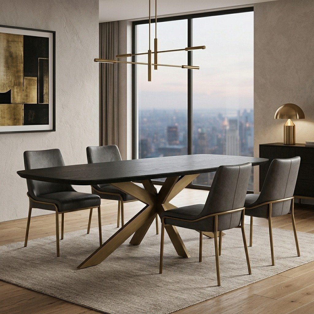 Supported by a brushed gold metal base, the PRITI table achieves a refined contrast that adds both stability and style. The gold accents introduce a luxurious touch, enhancing its urban aesthetic and making it a striking centerpiece. Measuring 280 x 110 x 76 cm, the table provides ample space for all your dining essentials, creating a comfortable setting for both casual and formal gatherings.