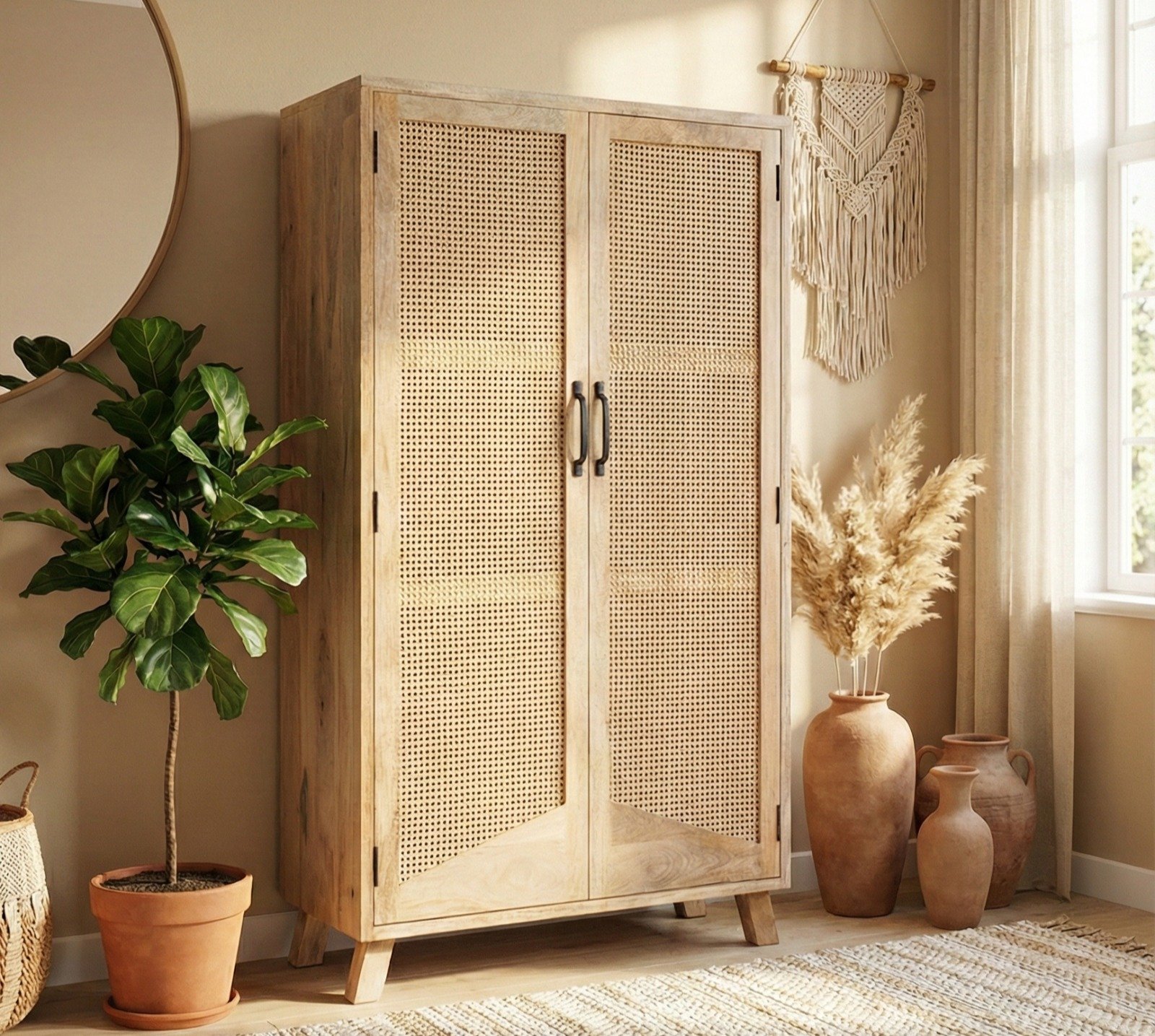 - Rattan Doors: The focal point of this closet is its beautifully woven rattan doors, which introduce a soft, organic texture that contrasts elegantly with the solid mango wood frame. This natural detailing adds warmth and a touch of bohemian sophistication to any room.