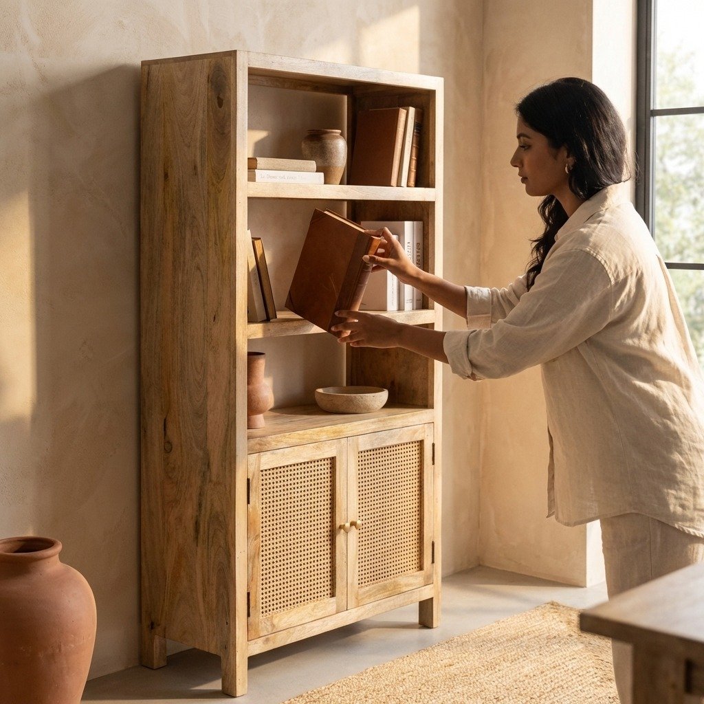 The PRITI Rattan Wooden Bookshelves (Solid Wood & cane ) combine durability with a stylish design, making them a valuable addition to any home. Their high-quality construction and ample space ensure that they meet both functional and aesthetic needs, enhancing your living or working environment.PRITI Rattan Wooden Bookshelves (Solid Wood & cane )