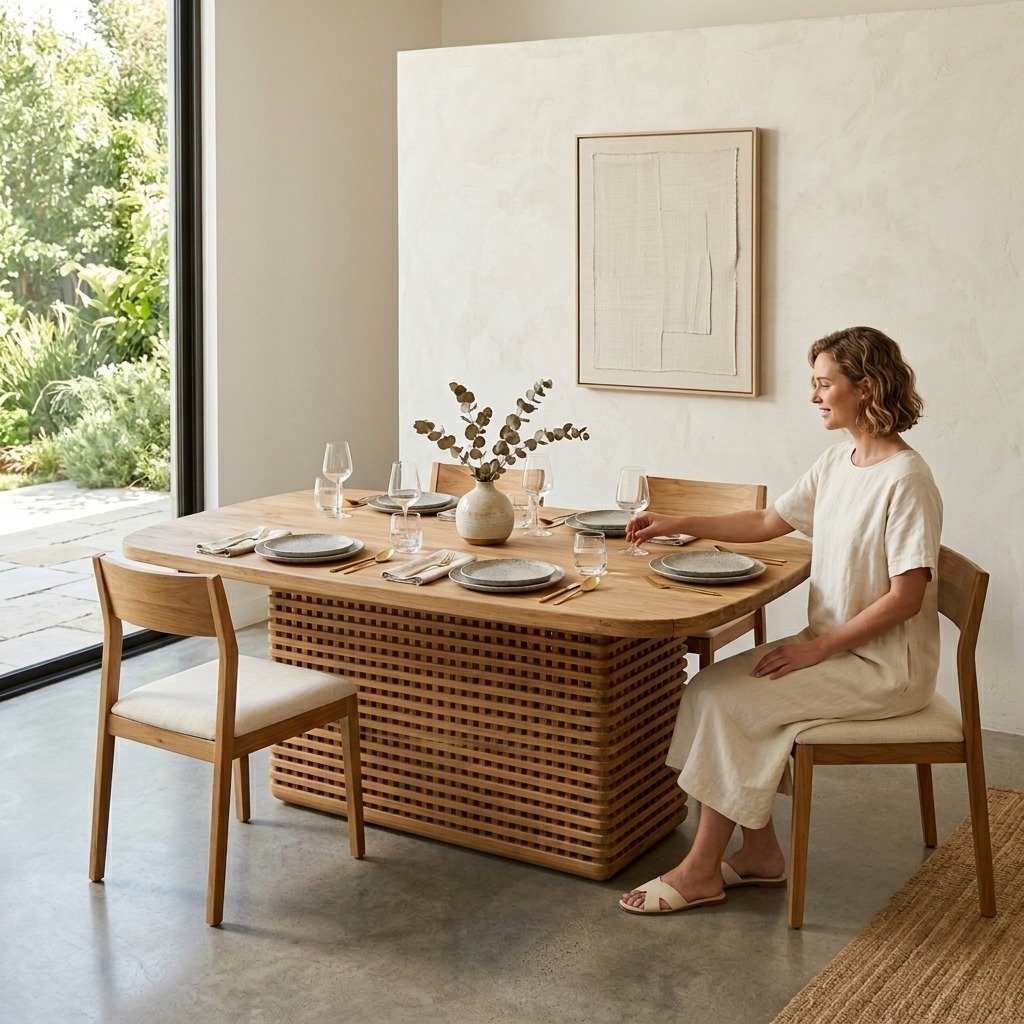 Transform your dining area with the PRITI Rectangular Dining Table (Solid Wood with cane ), a masterpiece of artisanal craftsmanship and sustainable design. Handcrafted by skilled Indian artisans from premium solid teak, this table features intricate lattice frames and robust mortise-and-tenon joinery, reflecting both traditional craftsmanship and modern aesthetics.