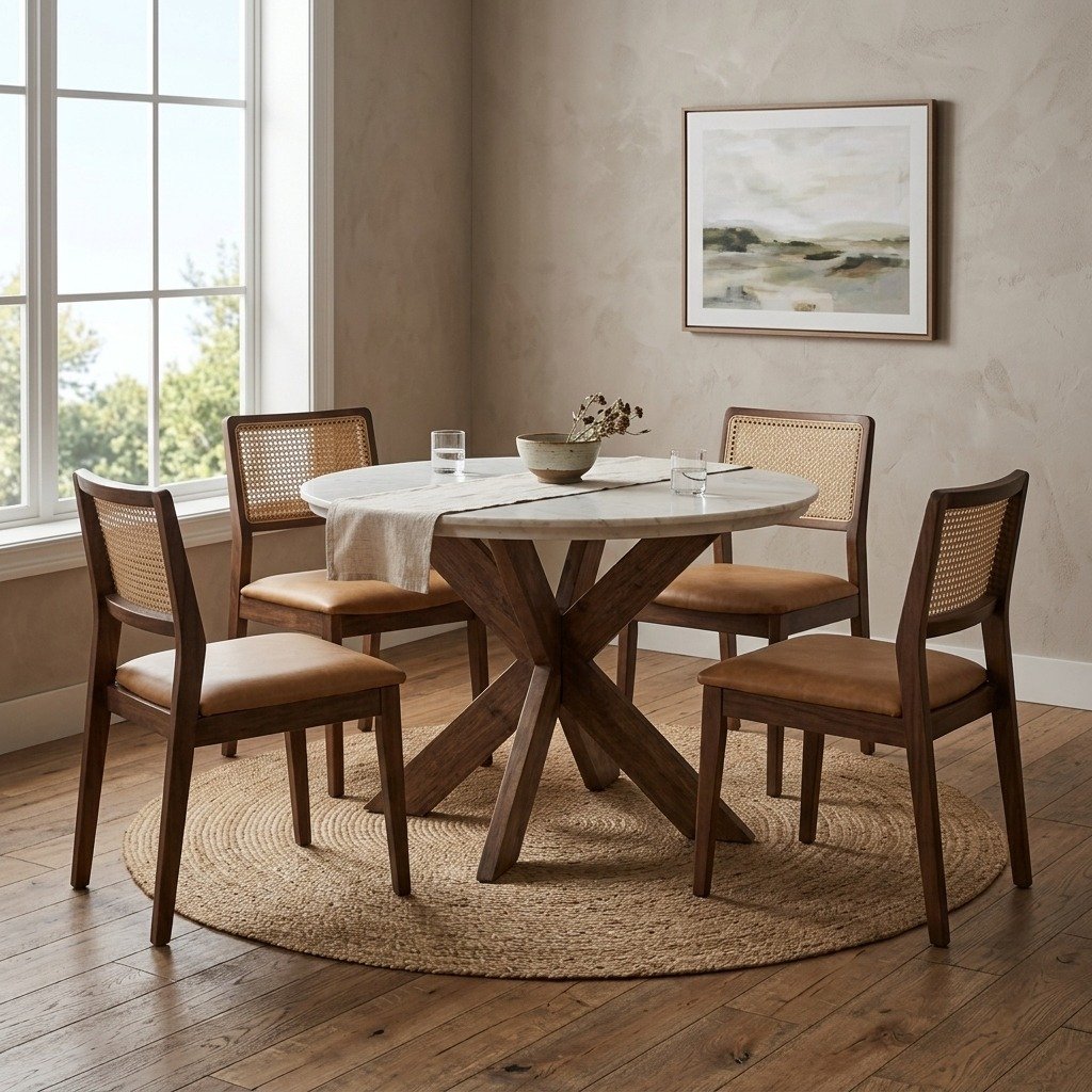 - Functionality: The round shape of the table makes it a versatile piece, perfect for family meals, casual gatherings, or even as a work-from-home space. The intimate setting it creates allows everyone seated to be equally engaged in conversation, making it ideal for social dining. Its compact size also makes it a great choice for small apartments, breakfast nooks, or open-plan living spaces.