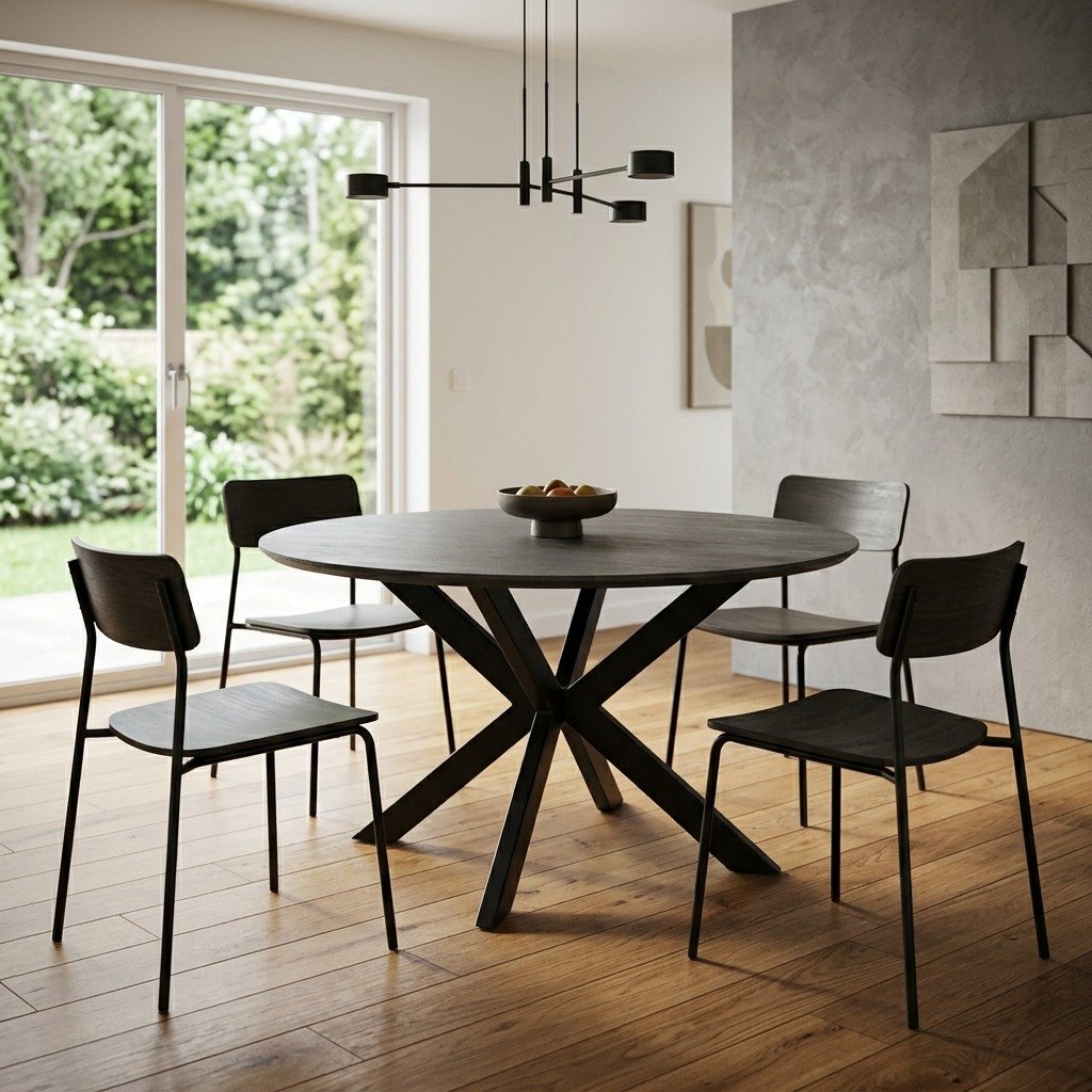 The PRITI Round Dining Table in Wood and Black Metal Legs blends a variety of styles, making it a versatile choice for different interior themes: