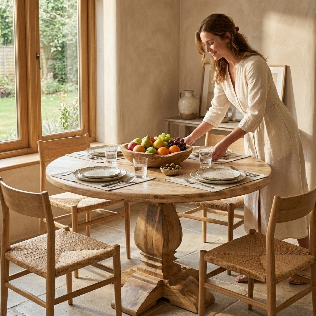 The PRITI Round Dining Table (Solid Wood )Â is the perfect centerpiece for fostering interaction and creating memorable moments with family and friends. Its design encourages guests to engage with one another, enhancing the warmth and conviviality of your gatherings.