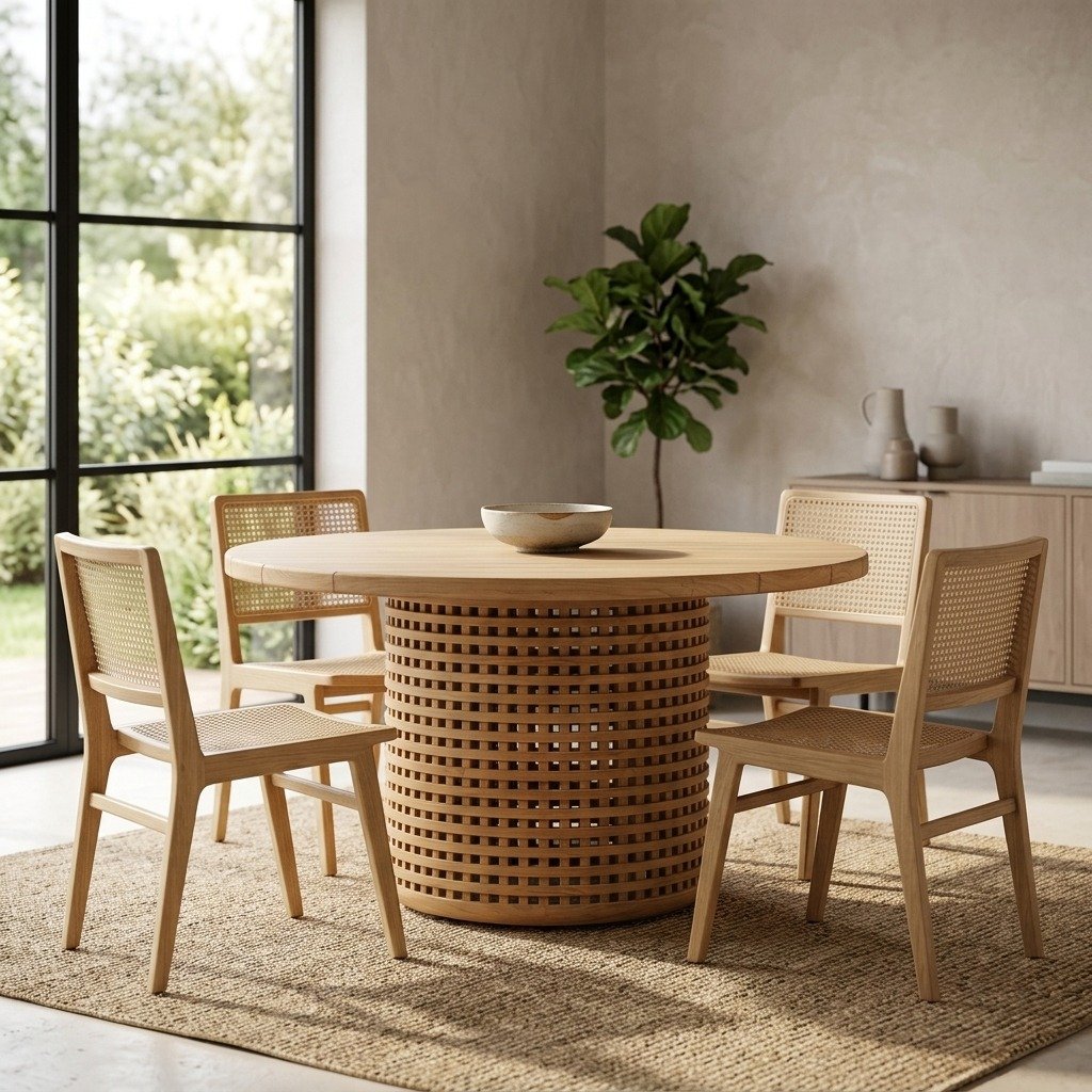 Elevate your dining experience with the PRITI Round Dining Table (Solid Wood with cane ), a stunning example of artisanal craftsmanship and sustainable design. Handcrafted by Indian artisans from sustainably harvested premium solid teak, this table showcases meticulous lattice frames and durable mortise-and-tenon joinery.