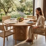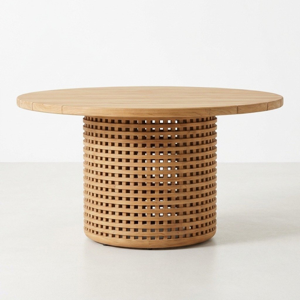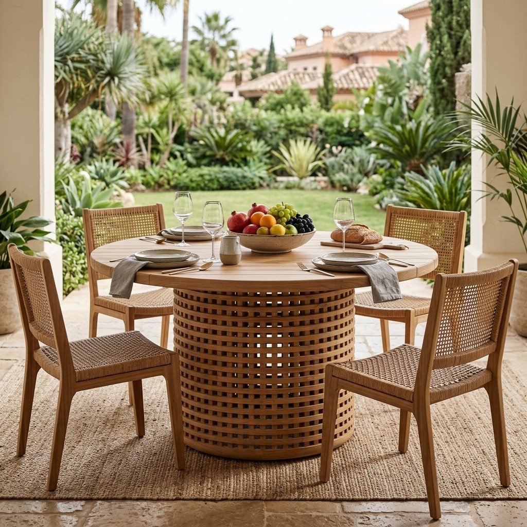 For optimal protection and to extend the lifespan of your table, we strongly recommend using custom-fit outdoor covers. This dining table seamlessly combines durability with sophisticated design, making it an ideal centerpiece for both intimate gatherings and larger celebrations in your outdoor setting.PRITI Round Dining Table (Solid Wood with cane )