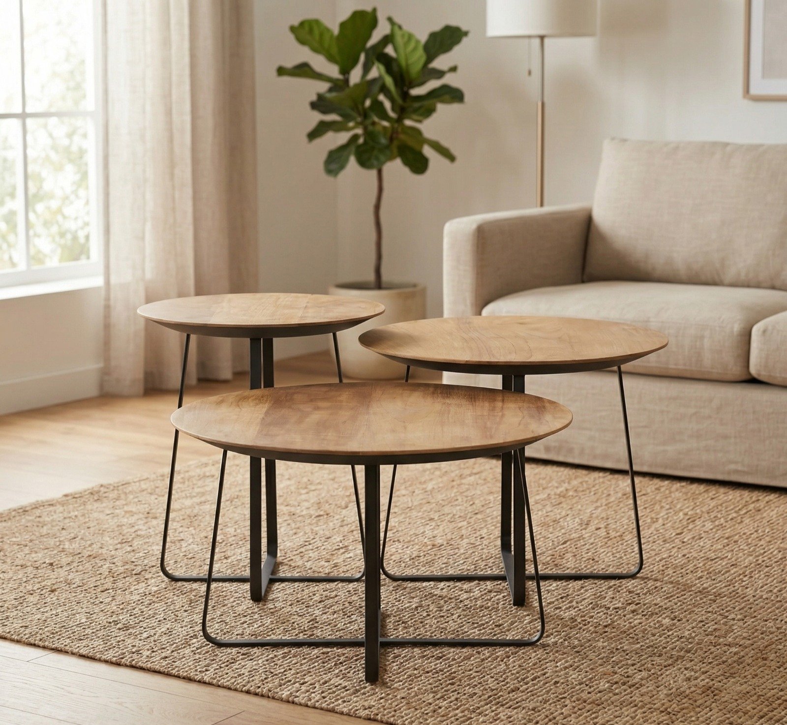 Design and Aesthetics: The PRITI Round Set of 3 Coffee Tables (Wooden & Metal Legs ) features a harmonious design with three matching round tables that share a cohesive look. Each table in the set is crafted with a modern, minimalist design that emphasizes clean lines and smooth curves. The round shape of the tables adds a touch of elegance and visual interest, making them suitable for a range of interior styles, from contemporary and industrial to classic and transitional.
