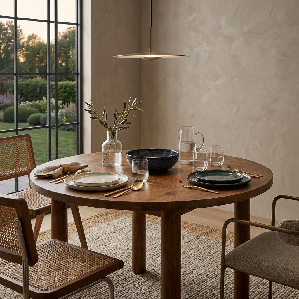 This dining table pairs beautifully with a range of upholstered chairs, allowing you to mix and match styles and colors to create a personalized dining environment. The splashes of color in the upholstery add a playful touch, while the sophisticated design ensures a cohesive look that fits seamlessly into any decor. Whether you prefer bold hues or subtle tones, this collection offers versatile options that bring comfort and style to your dining room. PRITI Round Solid Wood Dining Table