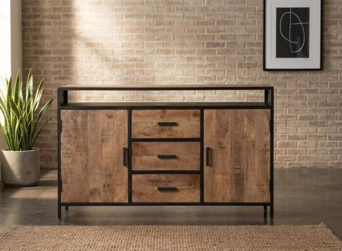Discover the PRITI Wooden Sideboard 150 cm (Mango Solid Wood ), a stunning piece that showcases the perfect blend of modern design and natural elegance. Crafted from high-quality wood with a beautiful natural finish, this sideboard features a striking combination of warm wood tones and robust black steel elements. The sleek design and bold lines of the cabinet create a visually appealing contrast, making it a standout addition to any interior.