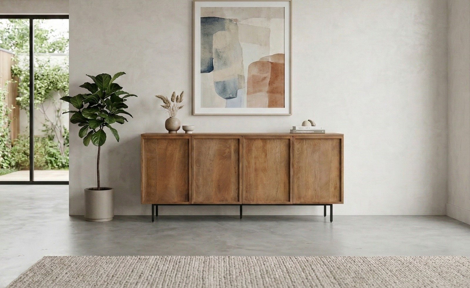 The PRITI 4-Door Sideboard with Metal Legs – 180 cm masterfully combines a contemporary aesthetic with a warm, inviting presence, making it a standout addition to any modern living space. The cabinet is crafted from sustainable hardwood, finished in a light brown natural shade that beautifully highlights the wood’s natural grain. This subtle yet elegant tone brings warmth and texture to your interior, creating an atmosphere of coziness and sophistication.