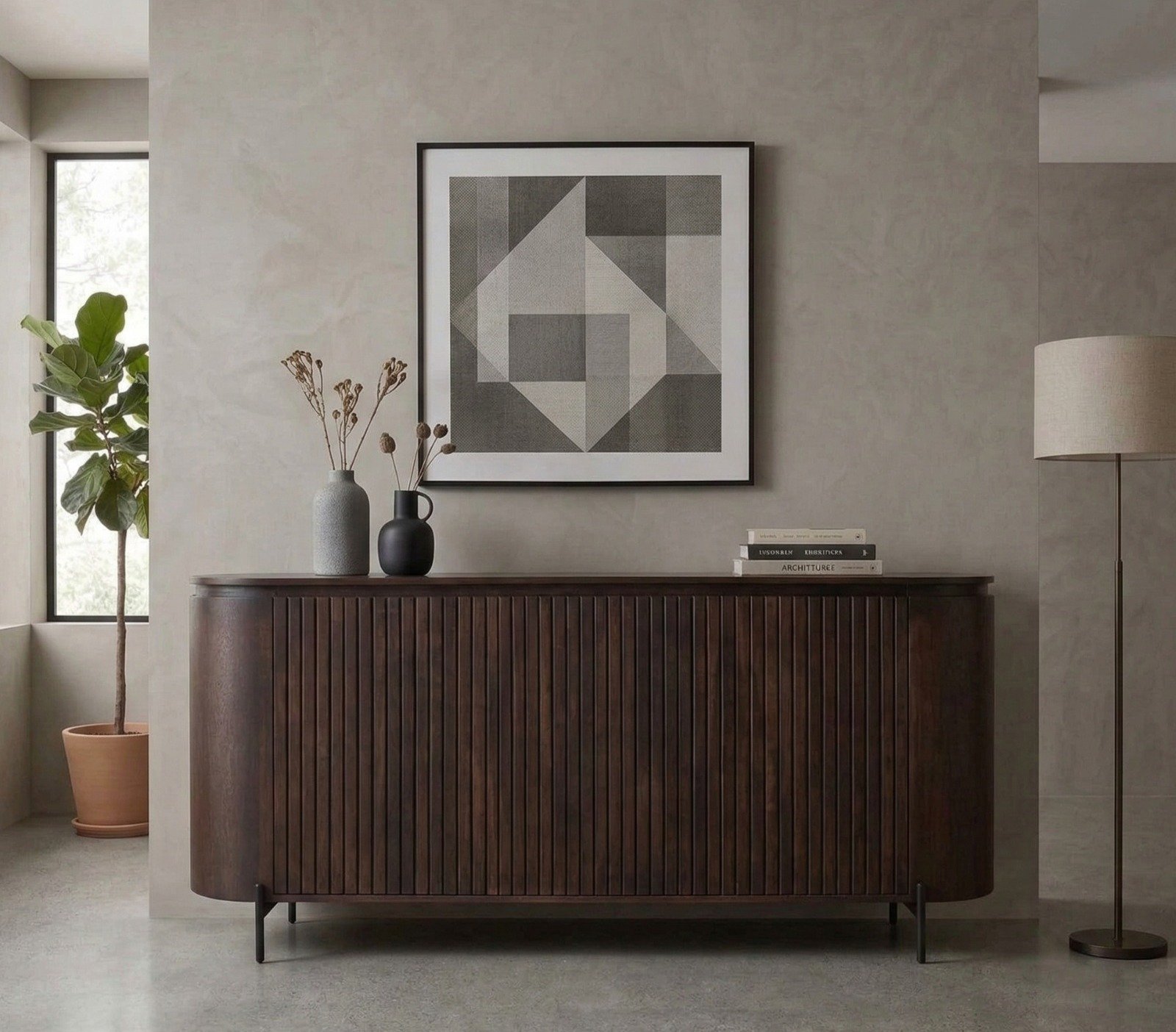 Versatility: The PRITI Sideboard’s versatile design allows it to serve multiple functions across different rooms in your home. In the dining room, it acts as an elegant buffet, providing storage for dinnerware and serving pieces, as well as a surface for entertaining. In the living room, it can function as a chic media console, offering space for electronics, media collections, and decorative accents. Its dark brown finish and sleek design make it adaptable to a range of interior styles, allowing it to seamlessly blend with or enhance your existing decor.