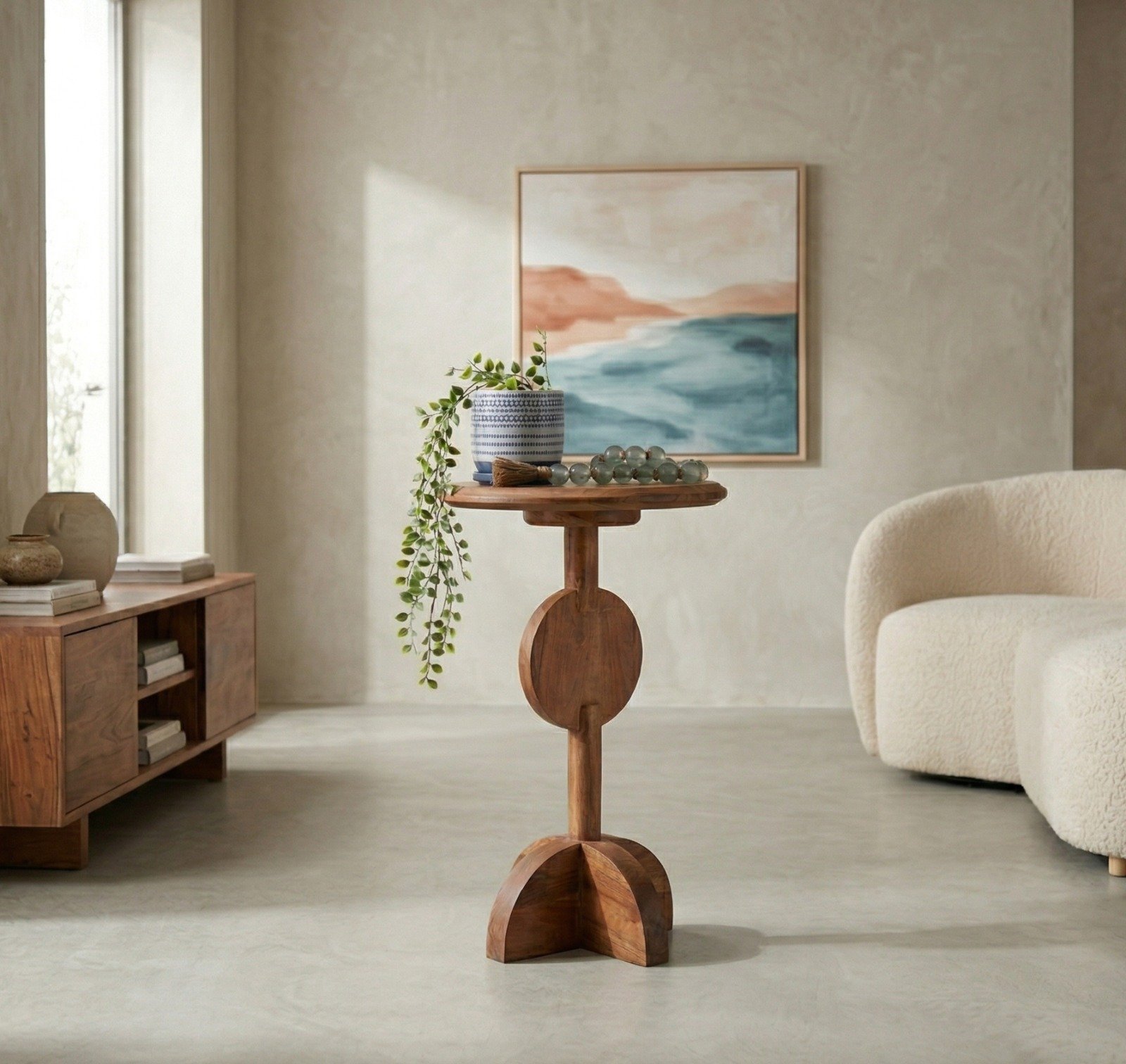 Crafted from solid wood, the PRITI End Table is built to last. Solid wood is known for its strength and durability, making it a practical choice for furniture that will see regular use. The table’s surface is finished with a protective coating that enhances its resistance to scratches, spills, and daily wear and tear. This finish also highlights the natural wood grain, adding to the table’s visual appeal. The sturdy construction ensures that the table remains stable and functional over time.
