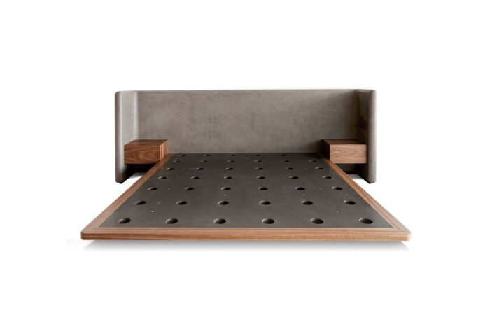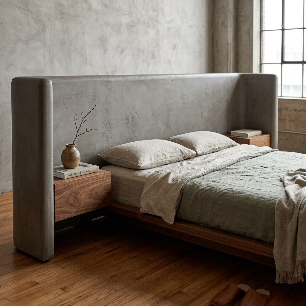 The bed’s standout feature is its micro-concrete upholstered headboard, crafted with precision to provide a smooth, polished finish. The natural variations in the concrete add a raw, elegant texture, ensuring that each bed is a unique work of art. Designed for durability, the micro-concrete headboard is not only visually striking but also easy to maintain, making it both practical and stylish.