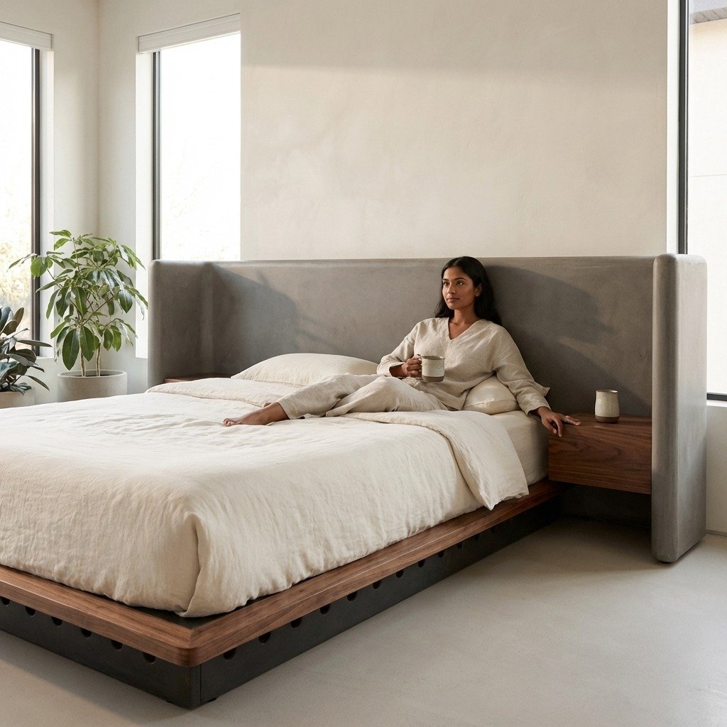Key Benefits: Floating design, micro-concrete headboard, premium materials, customizable mattress size, timeless modern aesthetics.