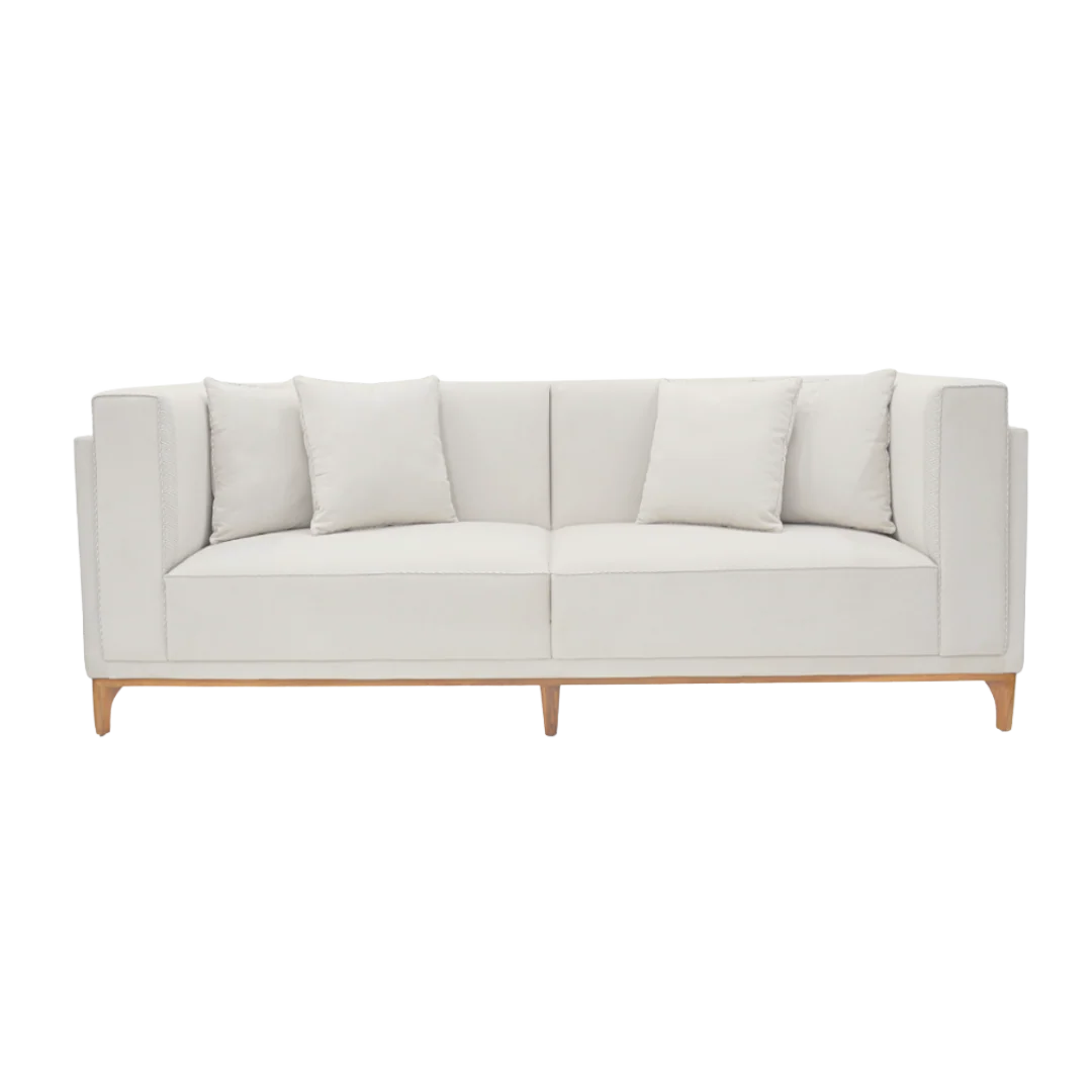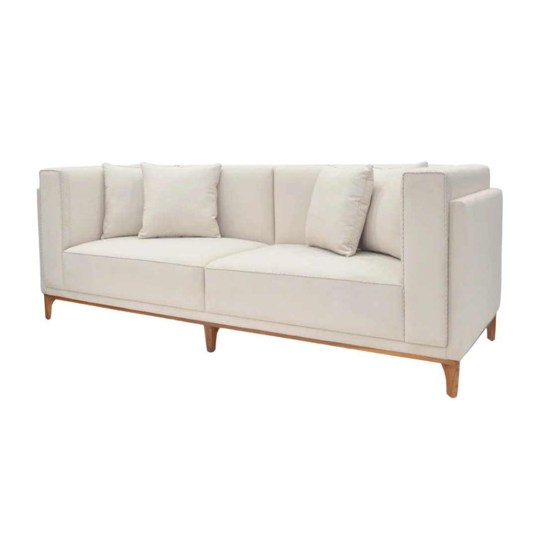 The Priti teak wood sofa beautifully pairs clean lines with subtle, thoughtful detailing, making it an elegant addition to any modern living space. Designed with a structured silhouette, this sofa features a solid teak wood base that adds natural warmth and visual grounding to the design. The soft, high-quality upholstery ensures comfort, making the Priti teak wood sofa perfect for everyday lounging, relaxed conversations, or quiet reading moments.