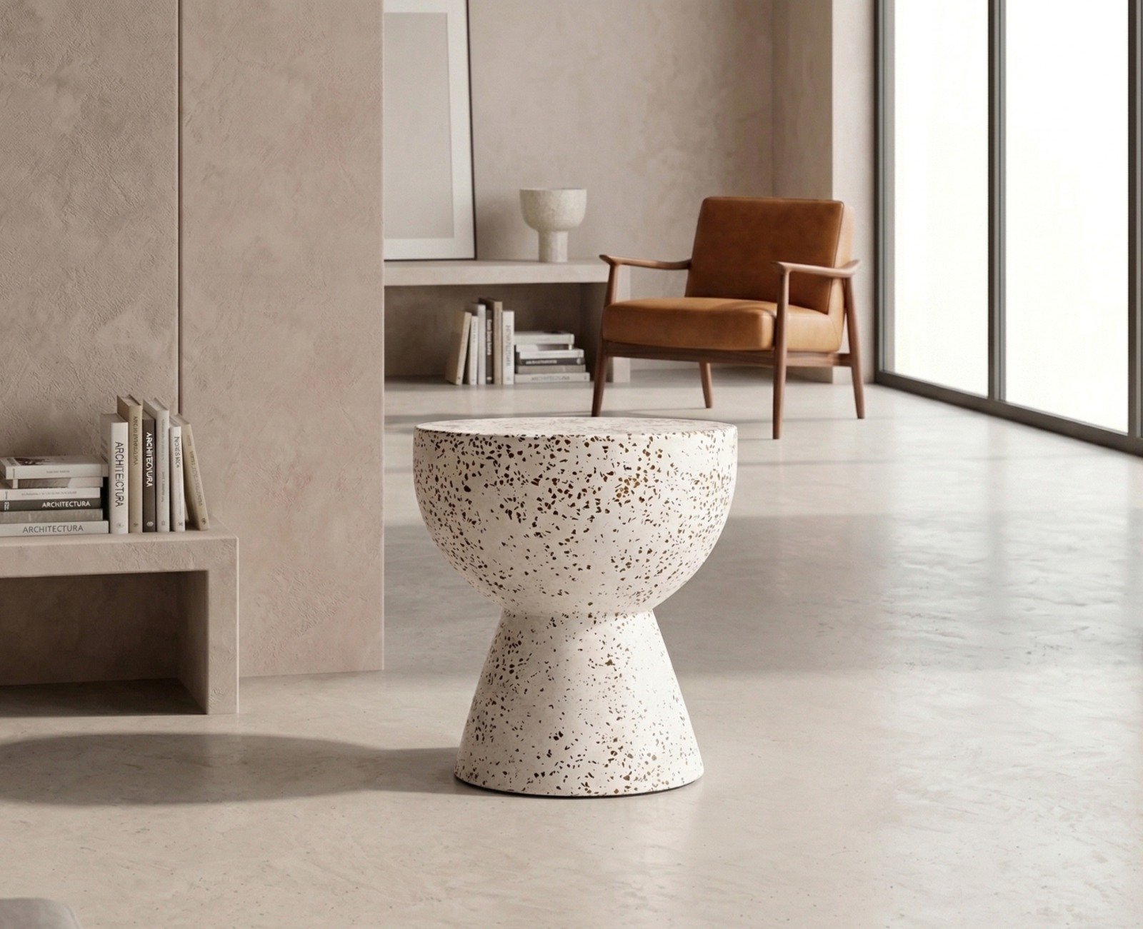 - Terrazzo: This side table is made from terrazzo, a durable mixture of marble chips and cement, giving it a distinctive speckled texture. The table’s white color provides a clean and modern aesthetic, fitting seamlessly into a variety of interior styles.
