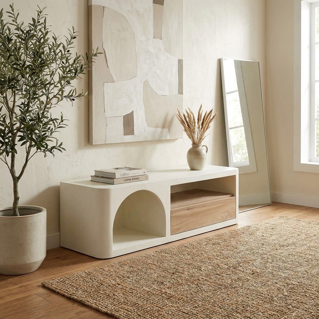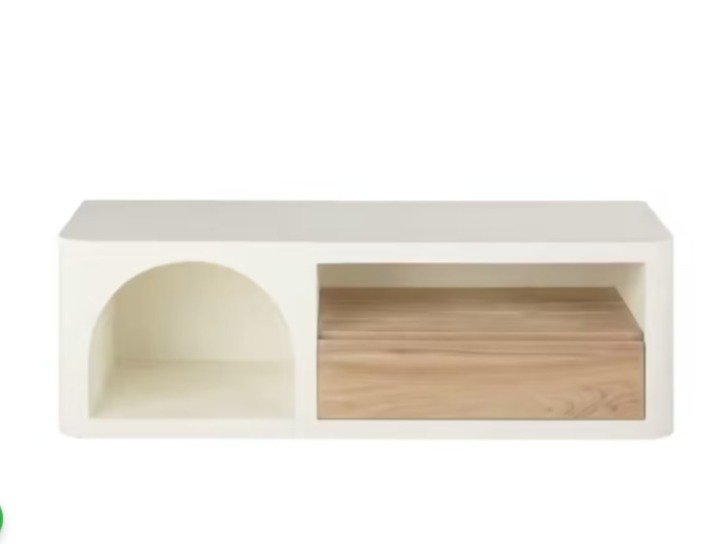 Zachte crèmekleur: de crèmekleurige afwerking brengt een zachte, neutrale toon in uw ruimte, waardoor het een verscheidenheid aan kleurenschema’s en stijlen kan aanvullen. De subtiele elegantie past naadloos in elke kamer en creëert een kalmerende en uitnodigende sfeer. PRITI TV cabinet 1 drawer 1 shelf