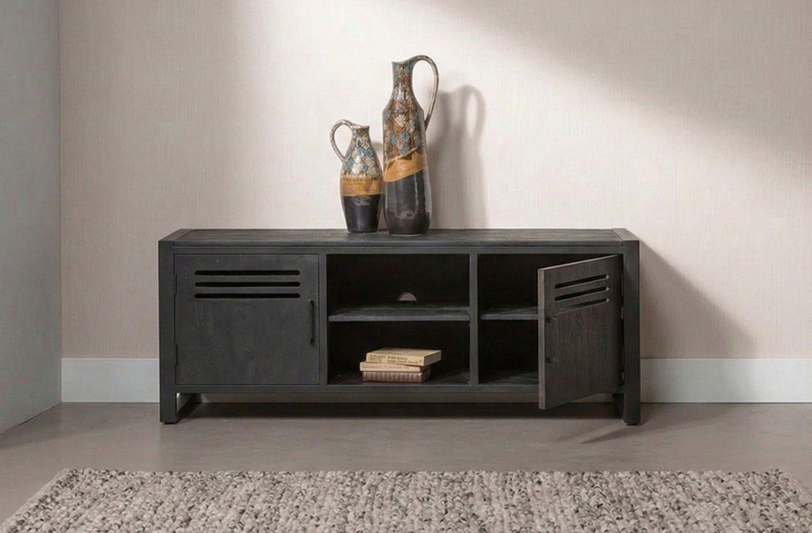 The PRITI TV Cabinet 151 cm Black is the perfect blend of style and practicality, offering a bold, industrial touch to your home while providing all the storage and functionality you need for your entertainment setup.