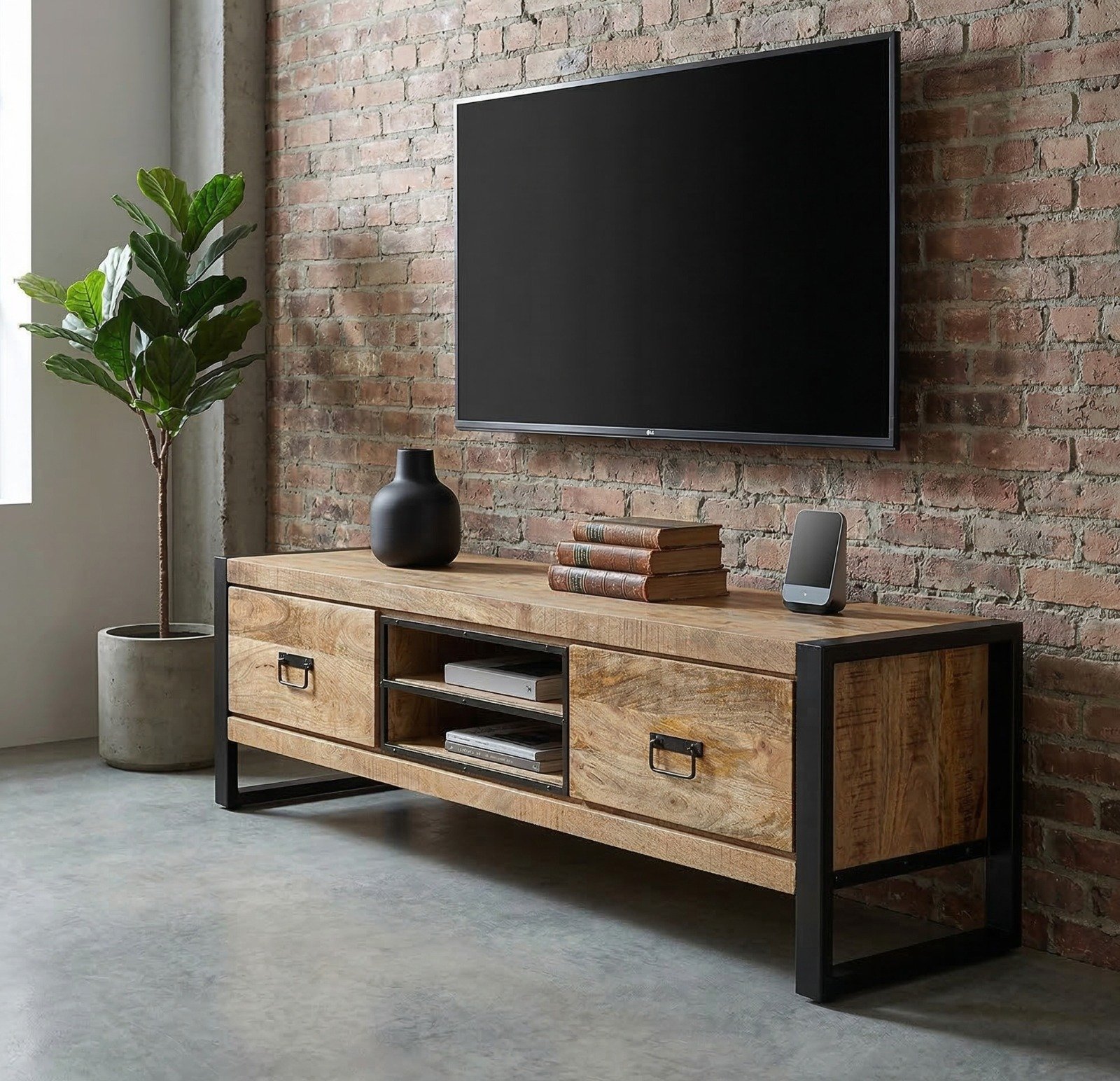 The PRITI TV Cabinet 160 cm (Solid Wood) is the perfect blend of functionality and style, offering a versatile solution for your living space. Designed to fit seamlessly into modern and industrial interiors, this cabinet provides ample space not only for your television but also for decorative items like plants, framed photos, or other accessories, allowing you to personalize your space effortlessly. PRITI TV Cabinet 160 cm