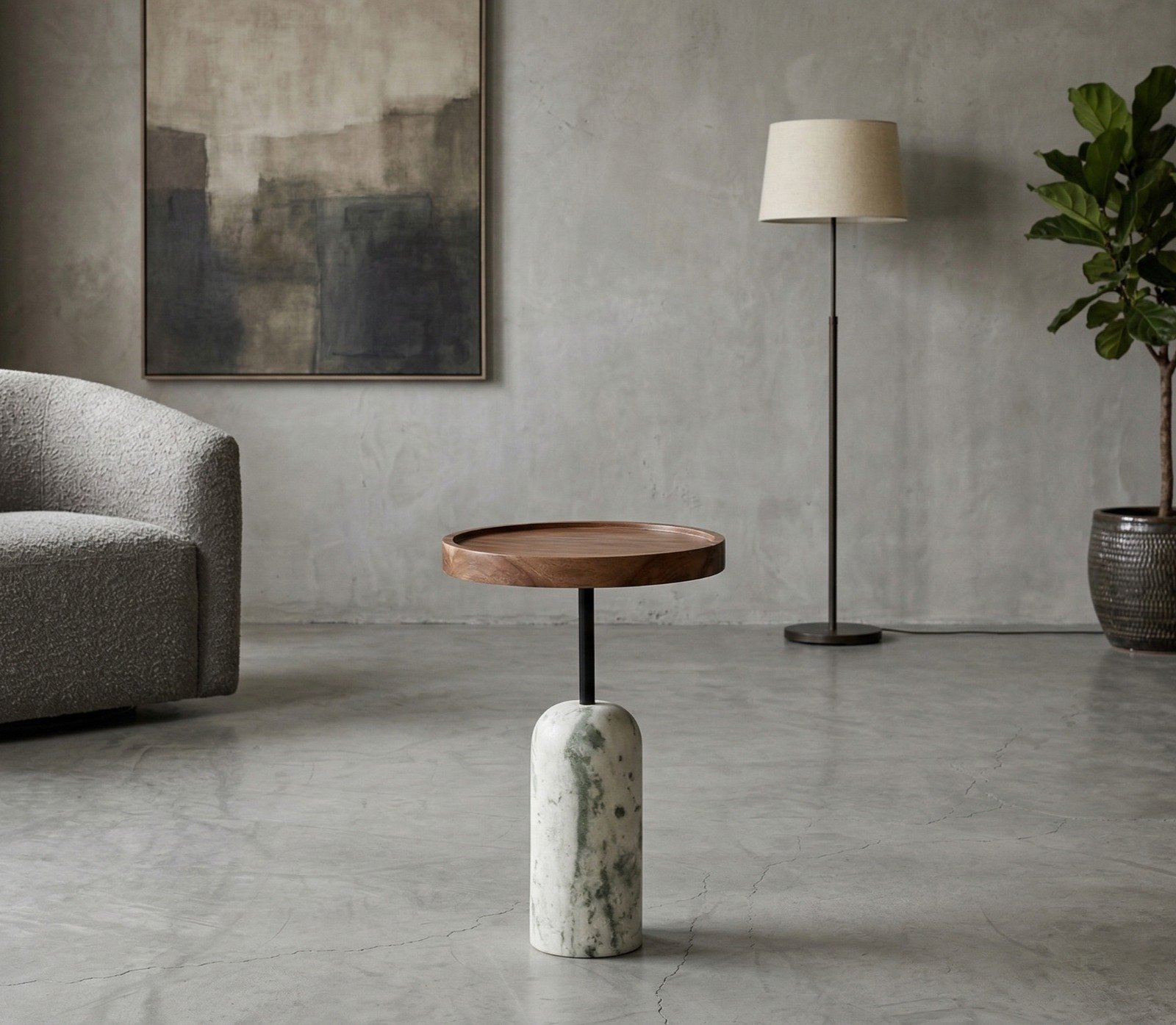 Elevate your home decor with the PRITI Wood and Marble Side Table, where organic forms meet refined craftsmanship, creating a piece that is both functional and aesthetically captivating.