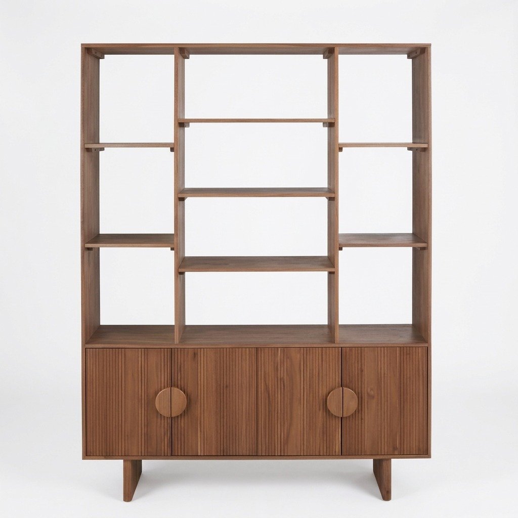 - Doors: The bookcase features four doors made from the same or complementary wood, which may include textured panels for added style.