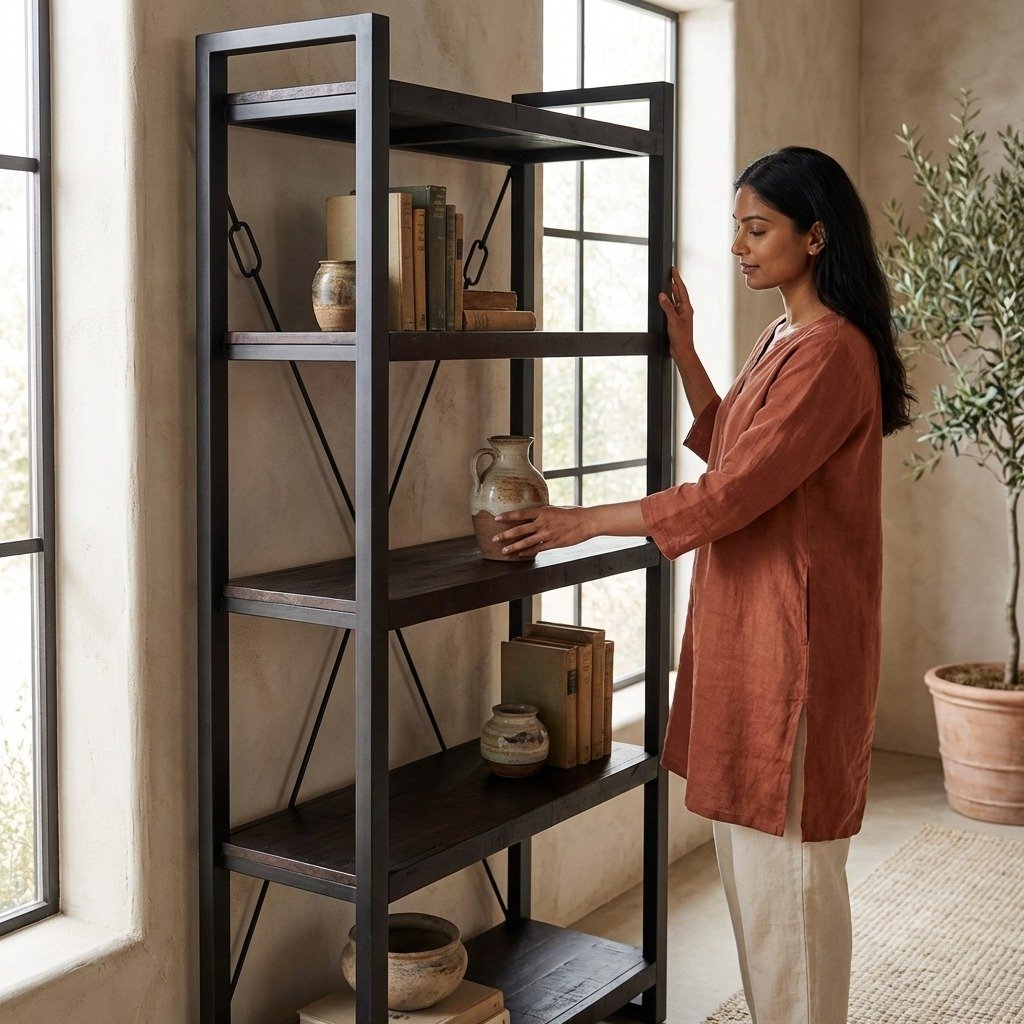 Each shelf is designed to be thick and sturdy, providing enough space to display books, decorations, or personal treasures. The spaces between the shelves offer flexibility, allowing for a well-organized yet visually dynamic display.