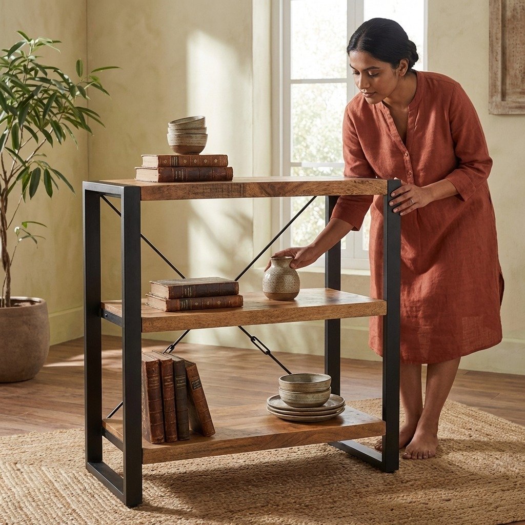 Crafted with solid wood planks, the bookcase is both sturdy and elegant. The wood is treated with multiple layers of wood oil, topped with a natural finish that enhances the beauty of the grain while protecting it from wear. This makes the bookcase easy to maintain—simply clean it with a damp cloth to preserve its quality and appearance over time. The metal frames, finished with a sleek black powder coating, add an industrial touch to the design while ensuring long-lasting durability. PRITI Wooden Bookcase 90 cm
